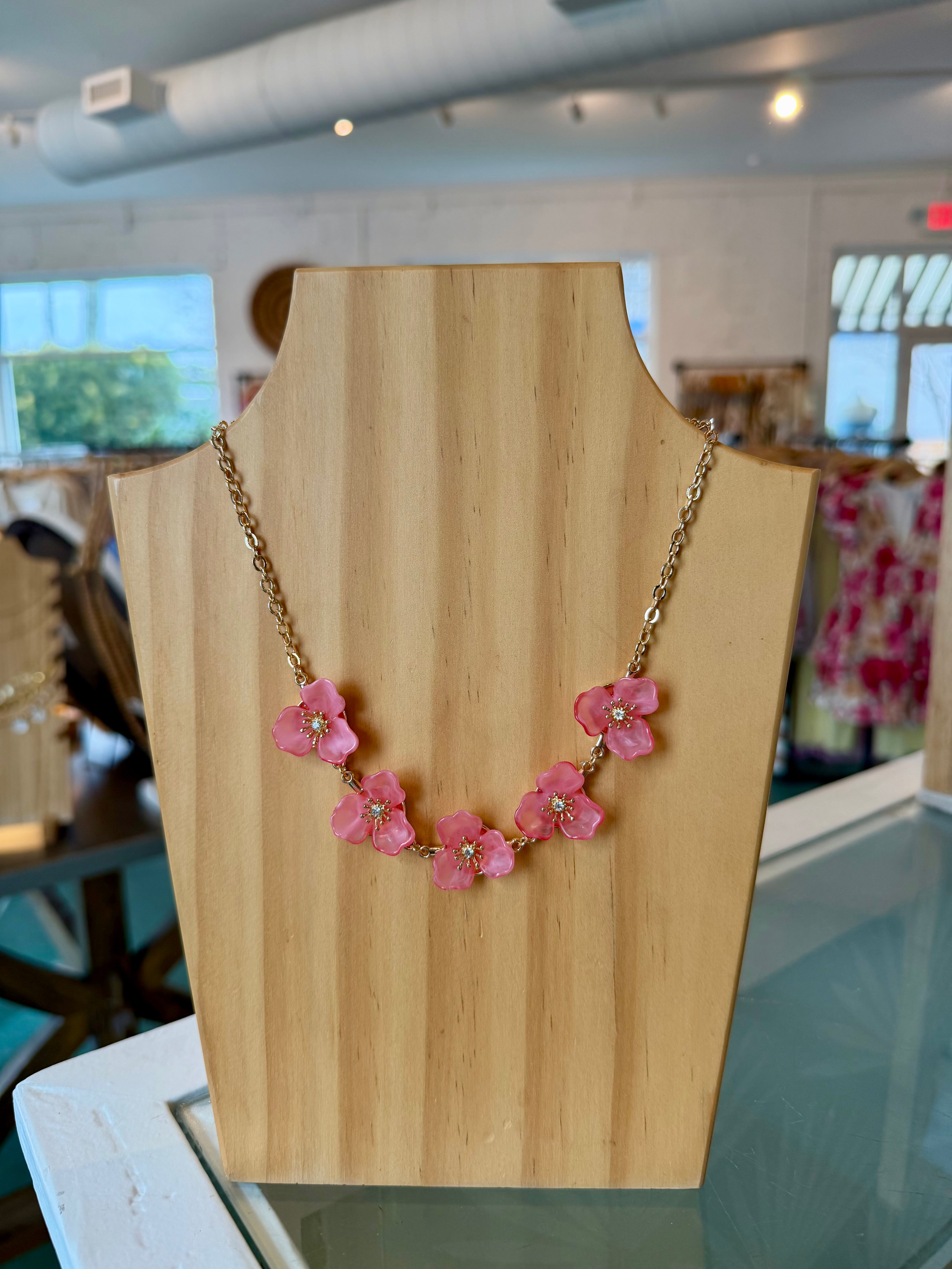 Delicate blooms dance along a lustrous gold chain in this enchanting Airlie Floral Necklace. Five intricately crafted flowers in your choice of soft white or blush pink create an effortlessly elegant statement that captures garden-inspired romance. The dainty design sits gracefully against the skin, making it the perfect accessory for garden parties, bridal events, or any occasion calling for understated sophistication. Layer it with other pieces or wear it solo—either way, this timeless necklace brings a touch of botanical beauty to your everyday style.