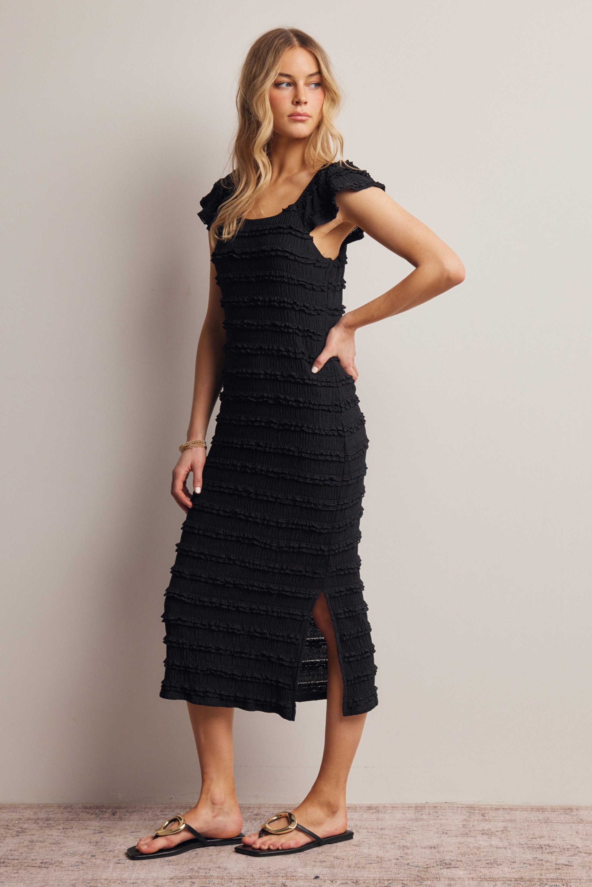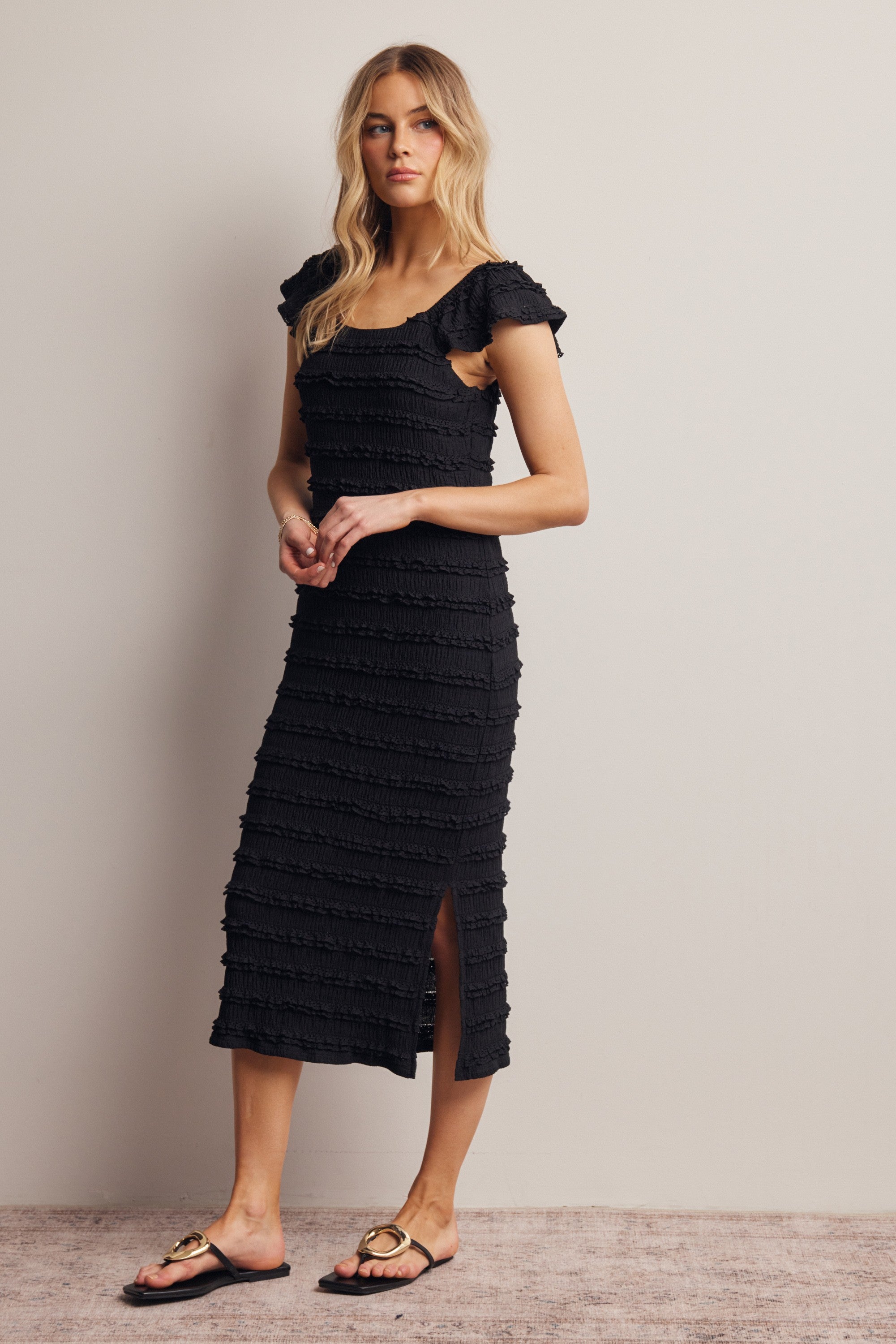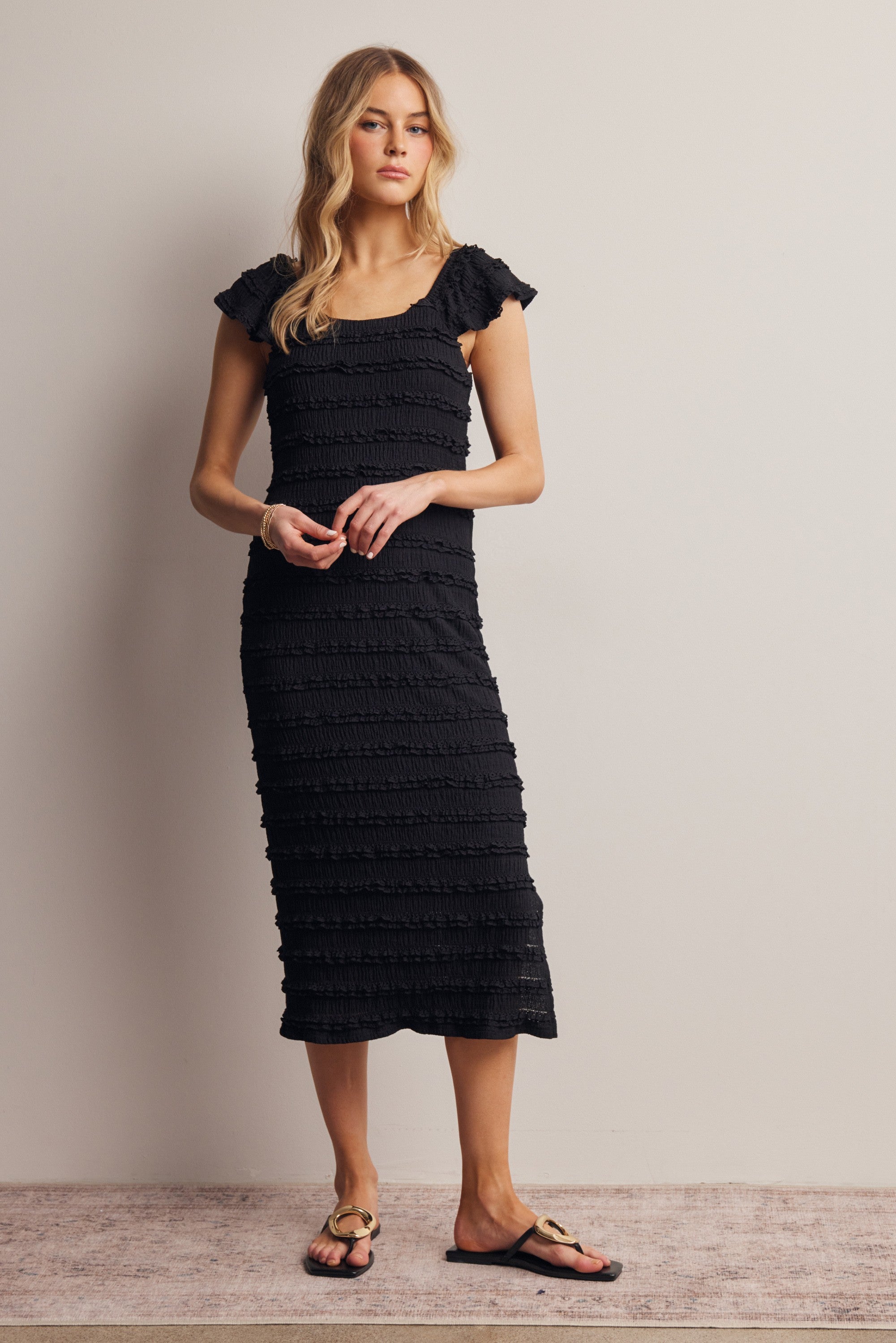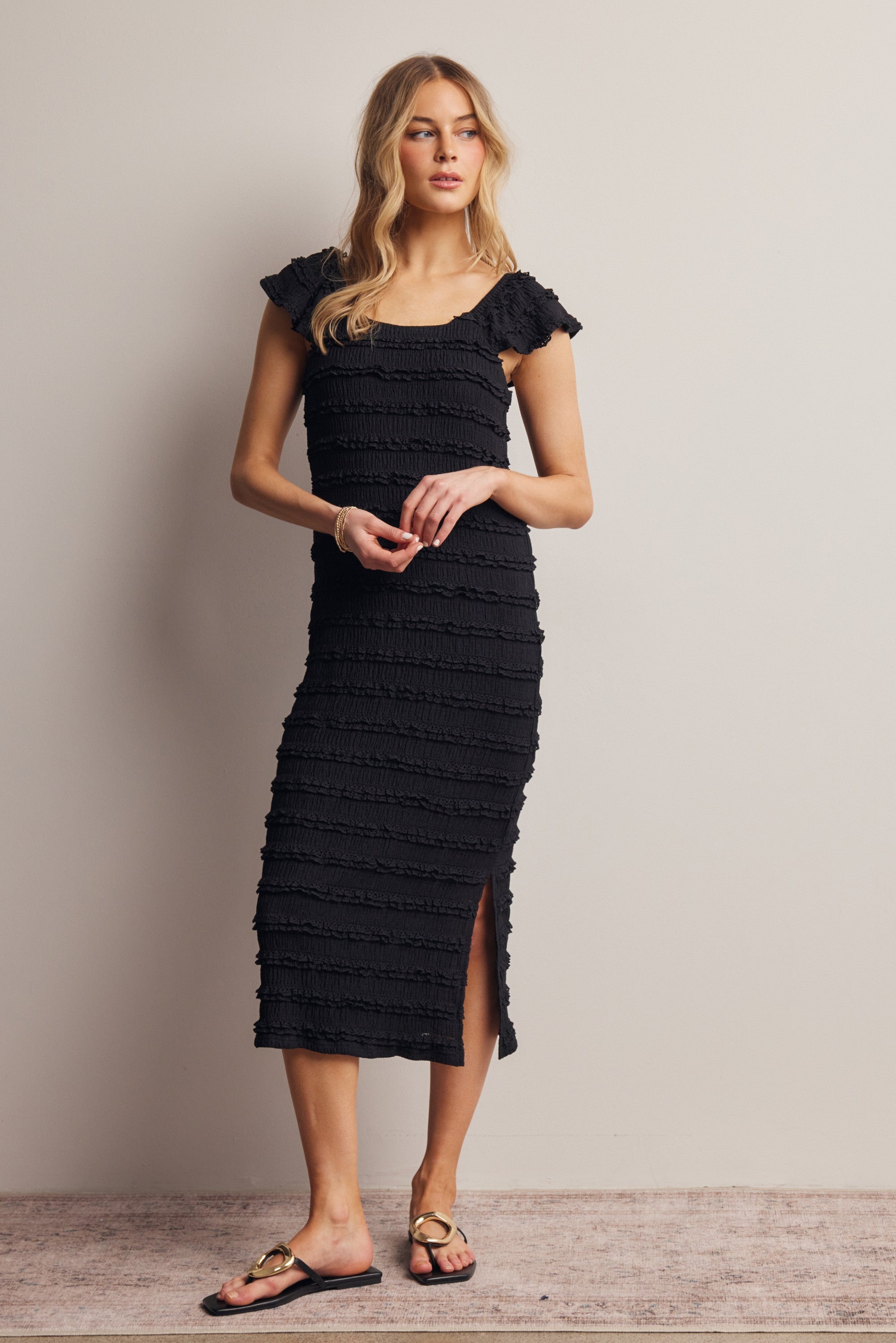 The Black Dahlia Midi Dress combines effortless elegance with thoughtful design details. Crafted from a soft, lightweight woven fabric featuring an allover smocked texture, this dress stretches and moves with your body for all-day comfort. The square neckline frames your collarbone beautifully, while delicate ruffled cap straps add a feminine, boho-inspired accent. Fully lined for a smooth, polished look underneath, this versatile piece transitions seamlessly from casual days to dressed-up occasions.
