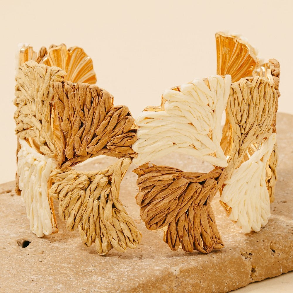 This exquisite cuff bracelet features a unique three tone raffia leaf design that adds a touch of elegance to any outfit. Made with precision and attention to detail, this bracelet showcases your refined taste and elevates your style effortlessly.