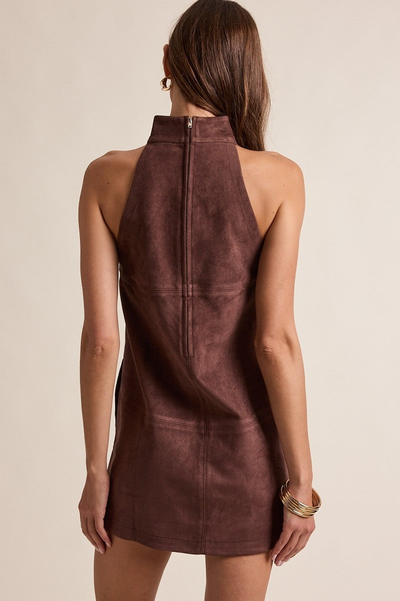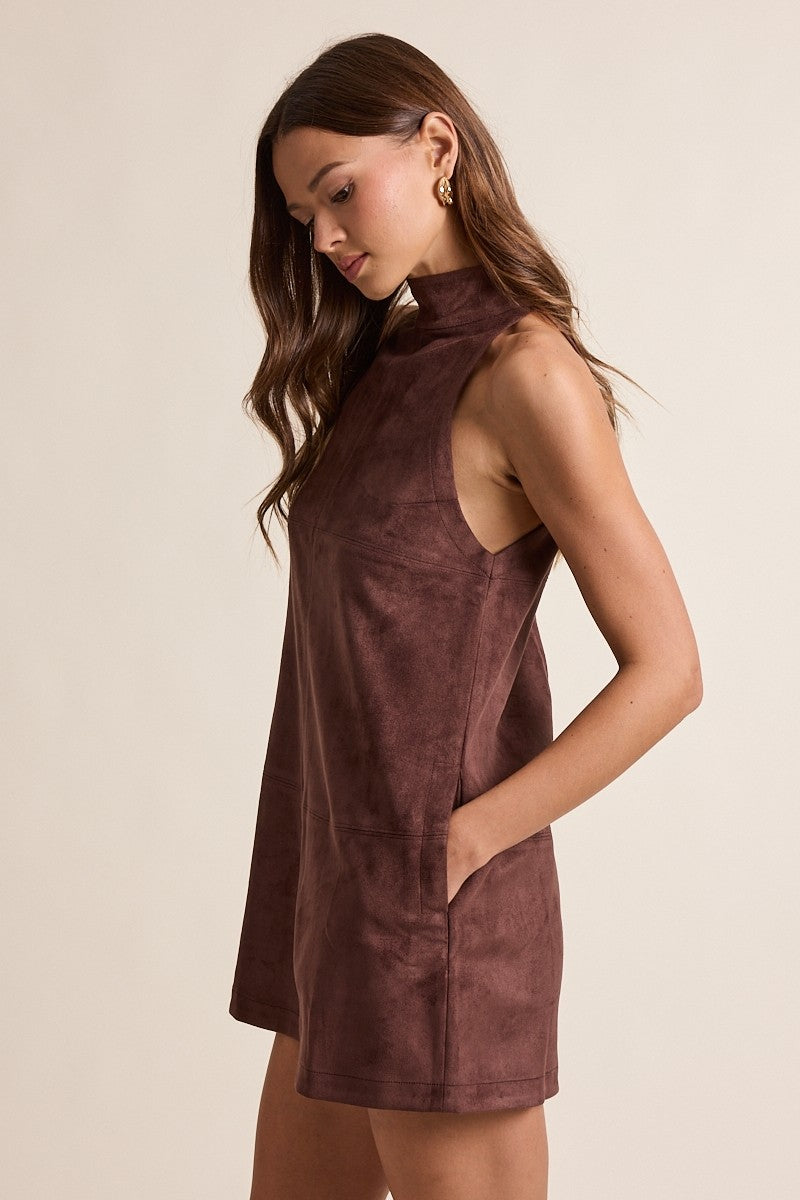 Discover effortless elegance with the Carefree Mini Dress, a stunning piece in soft suede with a rich solid color that transitions seamlessly from day to night. The mock neck provides a polished, modern look while the sleeveless design keeps you cool and comfortable. Practical side pockets add functionality without compromising style, and the back zipper ensures a smooth silhouette. Perfect for those who want to look put-together without the fuss, this mini dress is your go-to for any occasion.