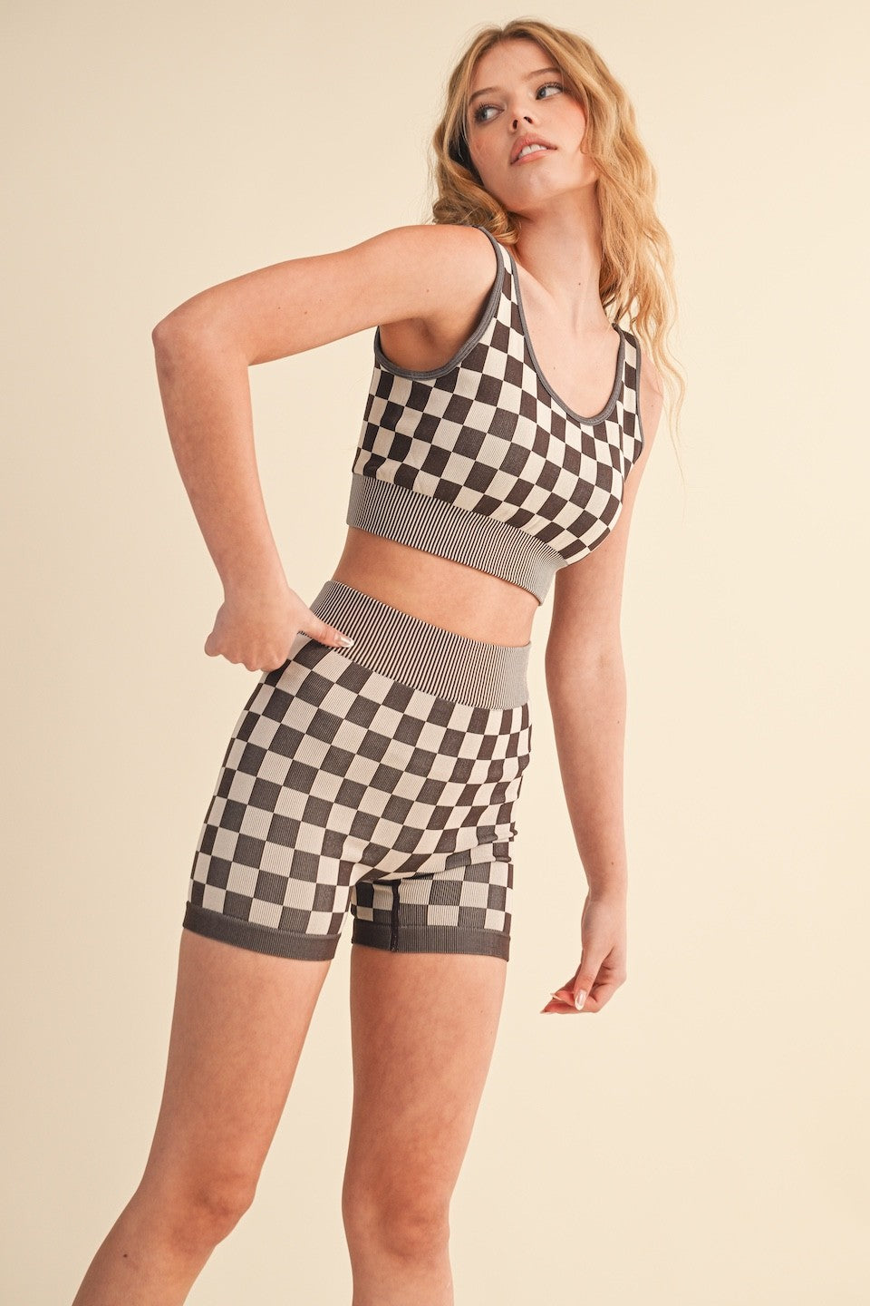 This seamless checkered top sports bra is a must-have for any active lifestyle. With a body-hugging fit and square neckline, it offers both comfort and style. Whether you're running errands or hitting the court, this top will keep you feeling supported and confident. Perfect for summer days, this top is a versatile addition to your wardrobe. Make it a set with the Checker Charm Bottoms.