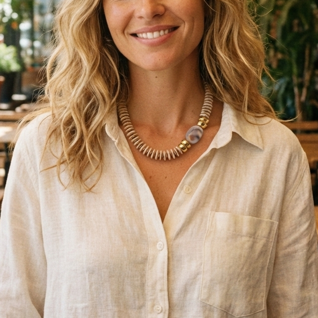 The Lyra Necklace is a stunning handmade statement piece featuring lightweight marble white disc beads paired with vintage 14k gold-plated hardware. Hand-knotted by artisans for exceptional quality, this chunky boho design measures 18 inches with a 3-inch extender and weighs just 2.5 oz for comfortable all-day wear. The secure lobster claw clasp ensures durability. Perfect for Mother's Day, spring, and summer occasions, this versatile necklace elevates any outfit with effortless elegance and timeless appeal.