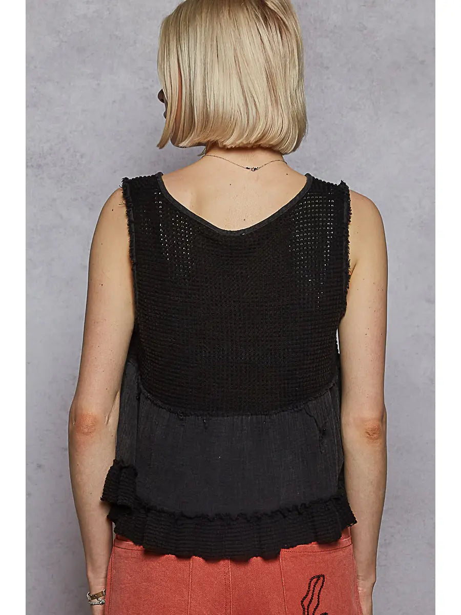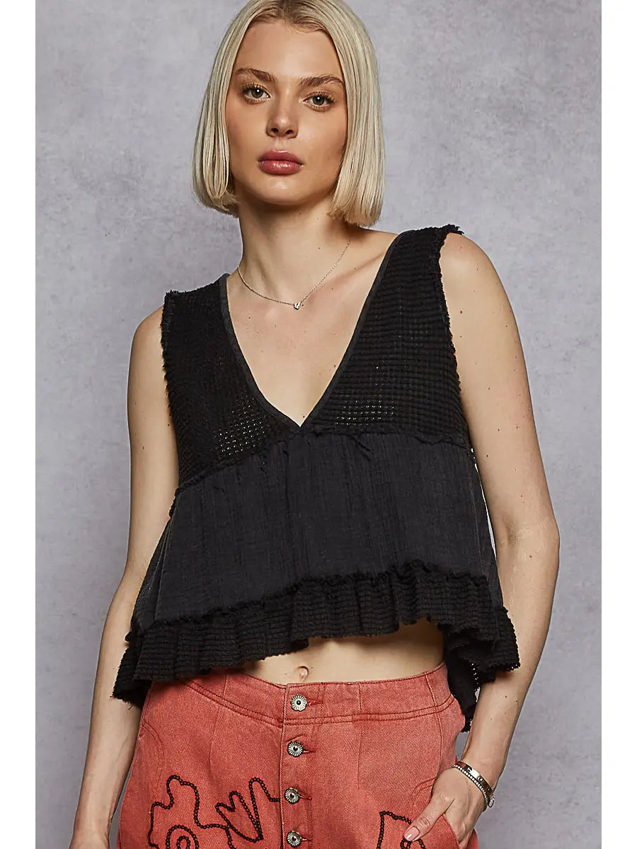 The Coastal Breeze Tank offers a flattering mini baby doll fit with charming ruffle details that add a playful touch. Crafted from a breathable blend of thermal and double gauze fabrics, it ensures comfort and lightness for warm days. Its sleeveless design and V-neckline make it an effortless choice to stay cool while looking effortlessly stylish.