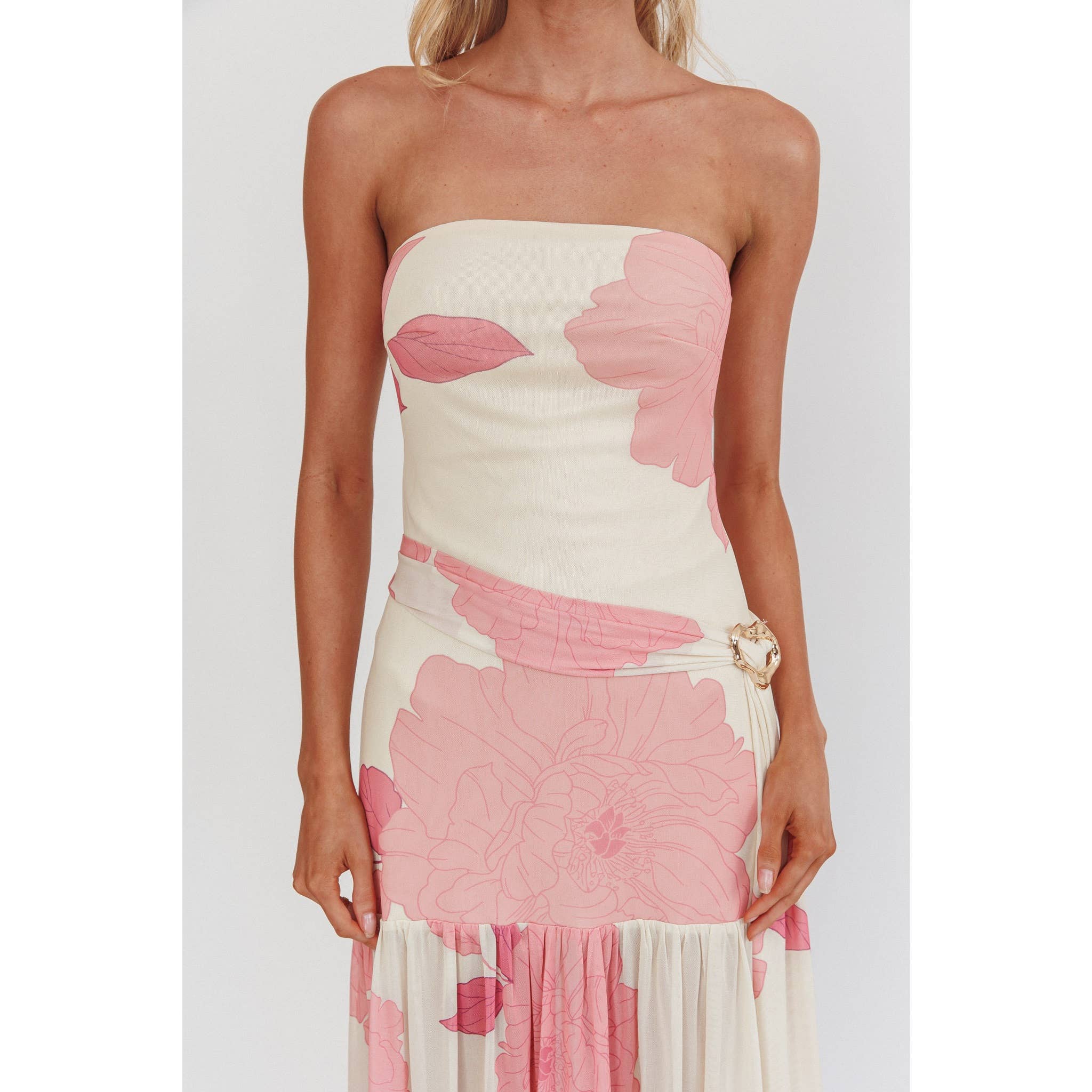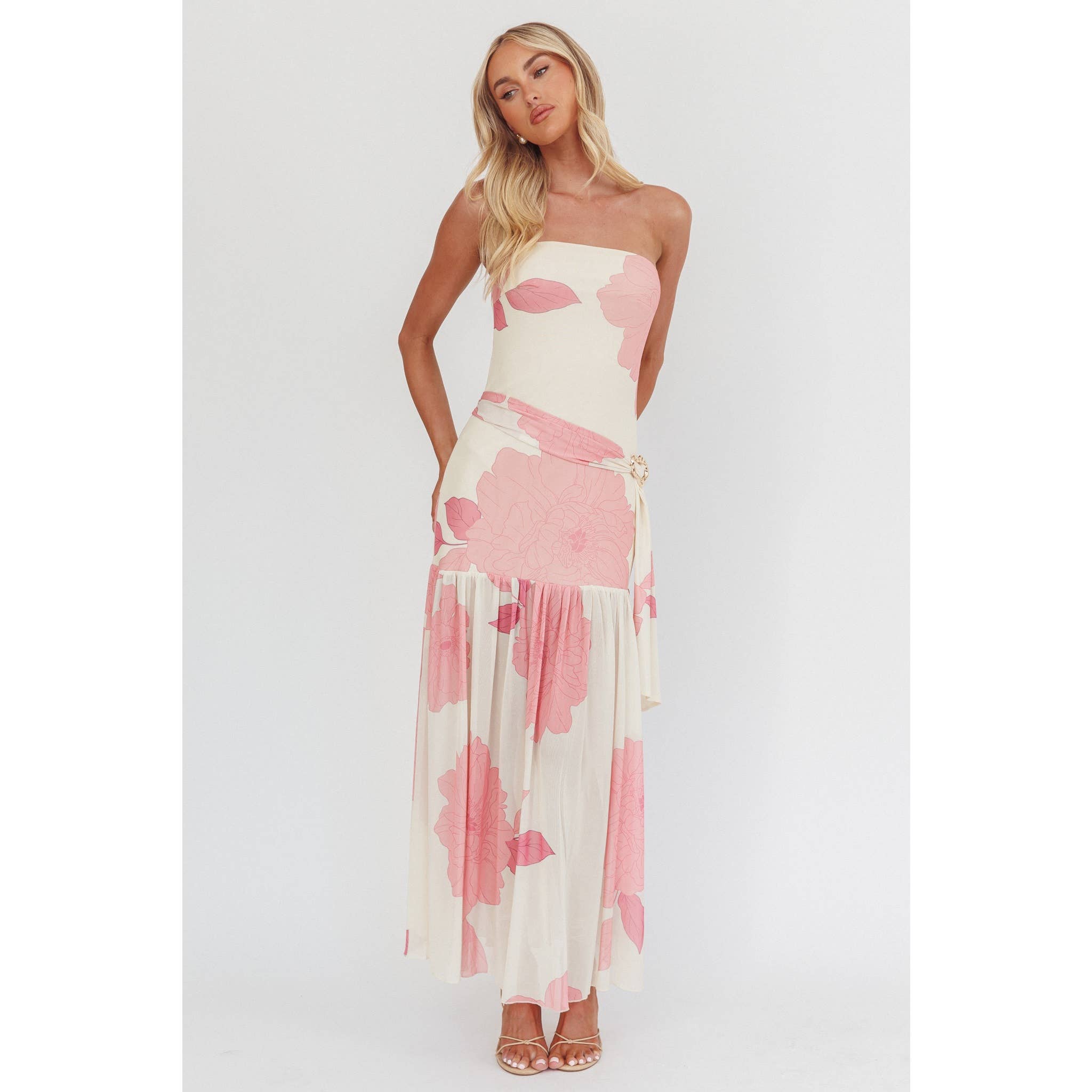 Elevate your wardrobe with the Rosaline Maxi Dress, featuring a strapless, floor-length silhouette in a soft cream base adorned with vibrant pink florals. The fitted bodice accentuates your shape while flowing into a sheer, pleated skirt that moves gracefully. A matching belt with a decorative clasp cinches the waist, adding a refined touch of elegance perfect for any special occasion.