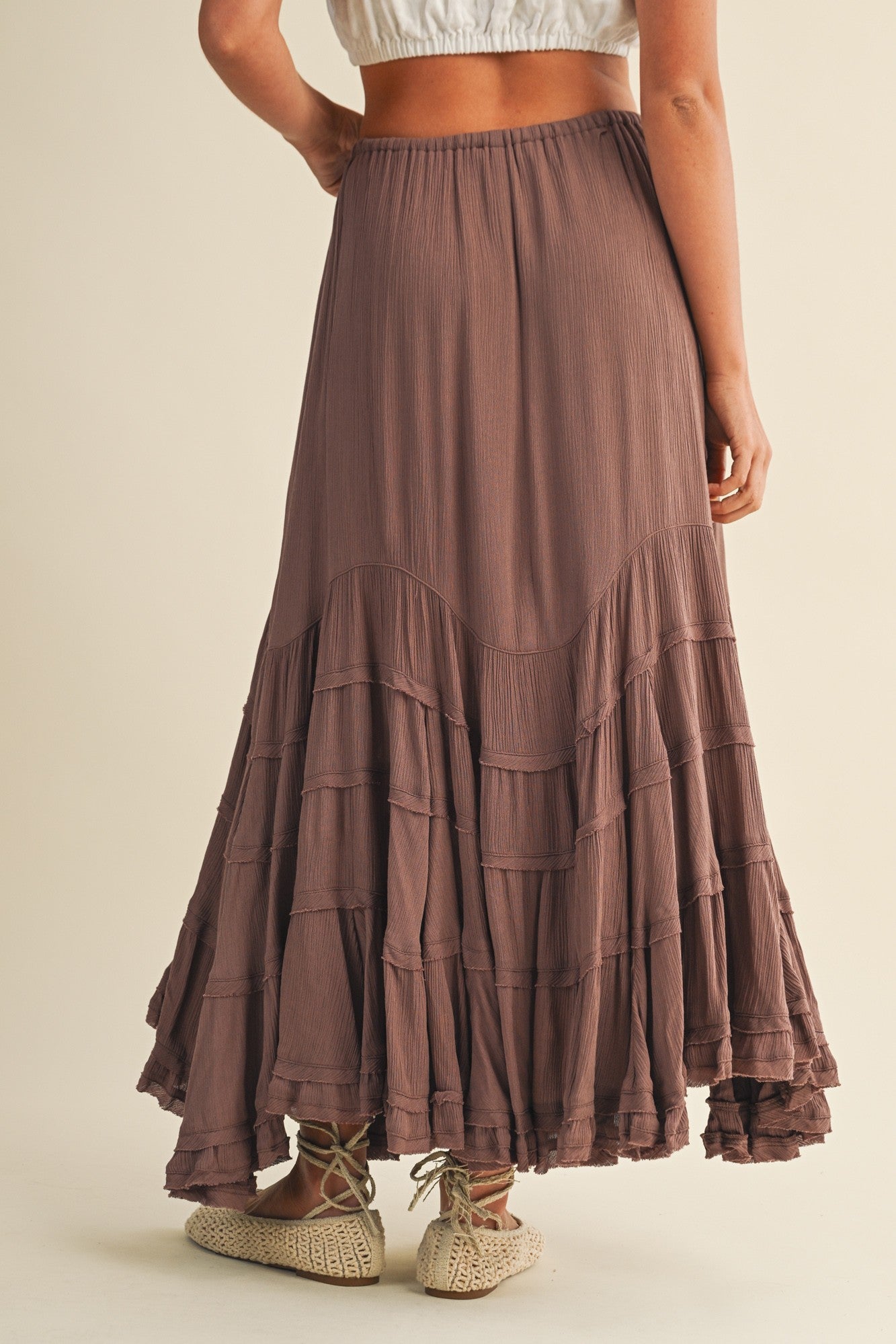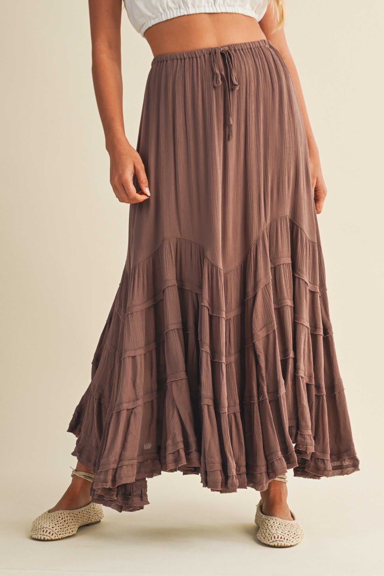 Elevate your wardrobe with the Deep Roast Maxi Skirt in a rich Americano hue. Its flowing silhouette offers effortless elegance, perfect for both casual outings and special occasions. Crafted to provide comfort and style, this skirt pairs beautifully with your favorite tops, making it a versatile staple you'll reach for time and again. Embrace timeless sophistication with every step.