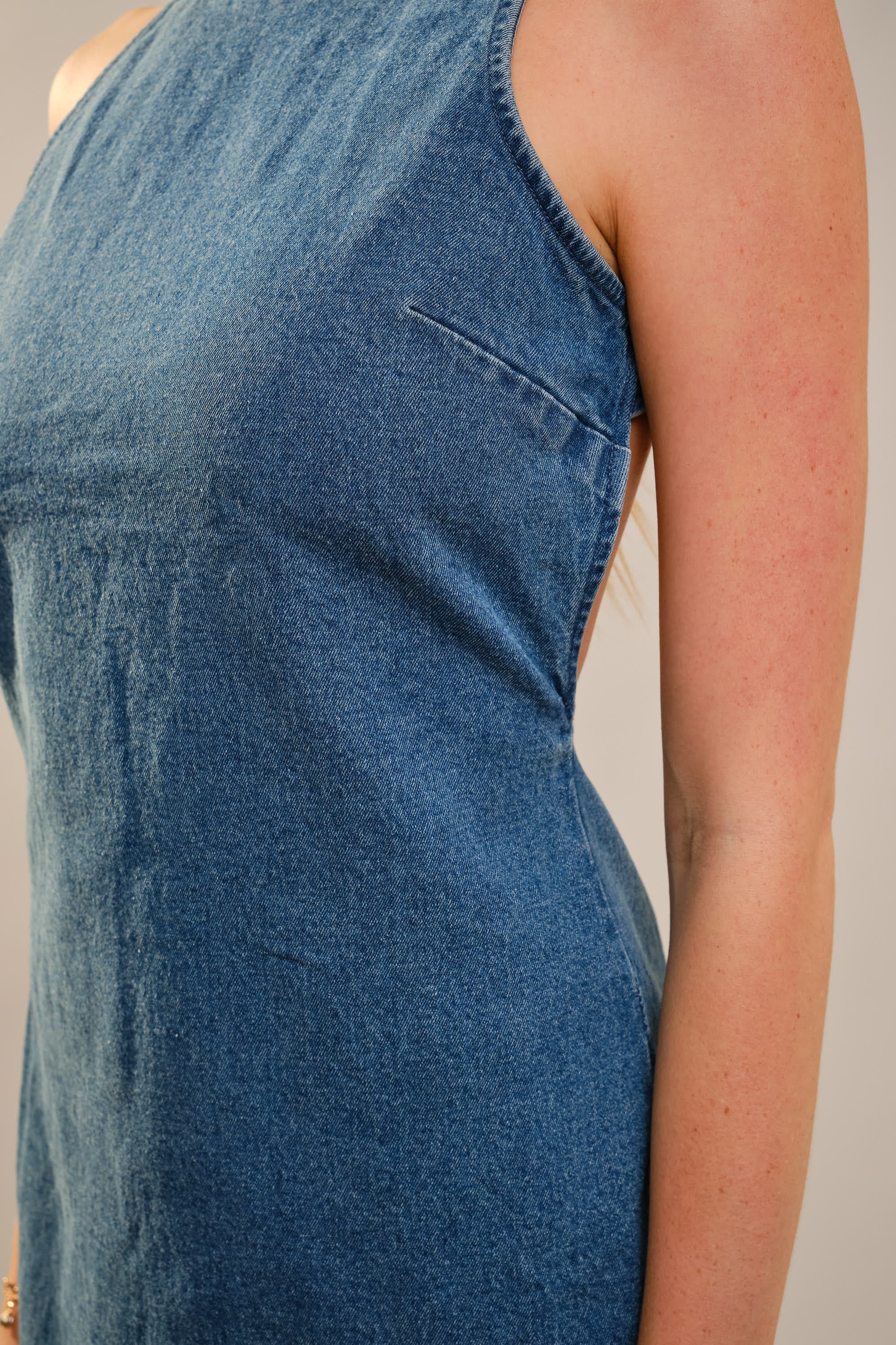 Elevate your style with the Denim Dusk Mini Dress, featuring a sleek sleeveless design and a flattering A-line silhouette that effortlessly enhances your shape. The high neckline adds a touch of sophistication, while the dramatic open back with a self-tie detail creates a captivating focal point. Perfect for day-to-night wear, this dress balances modern edge with timeless denim appeal.