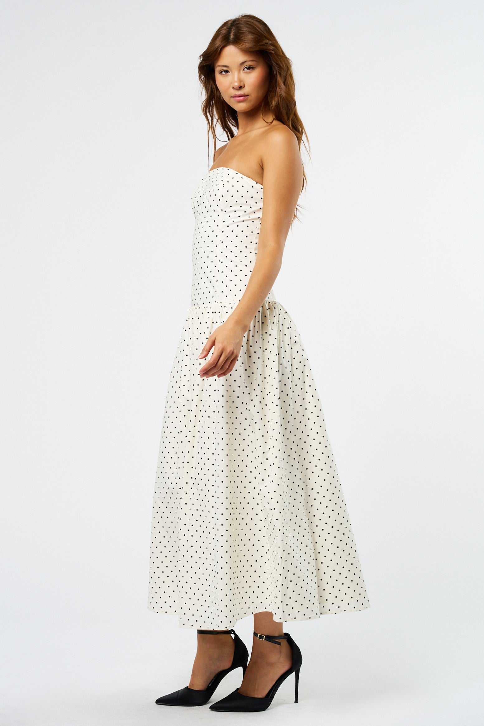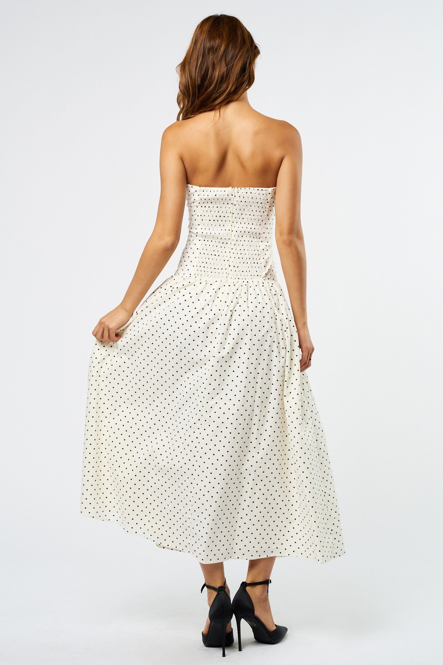 The Dottie Dreams Maxi Dress combines classic charm with a carefree vibe. Featuring a bold polka dot pattern and a sleek strapless tube design, this maxi dress flows effortlessly from sunny afternoons to breezy evenings. Its timeless print and flattering silhouette make it the perfect choice for vacations, brunch dates, or any occasion where you want to feel stylish and comfortable.