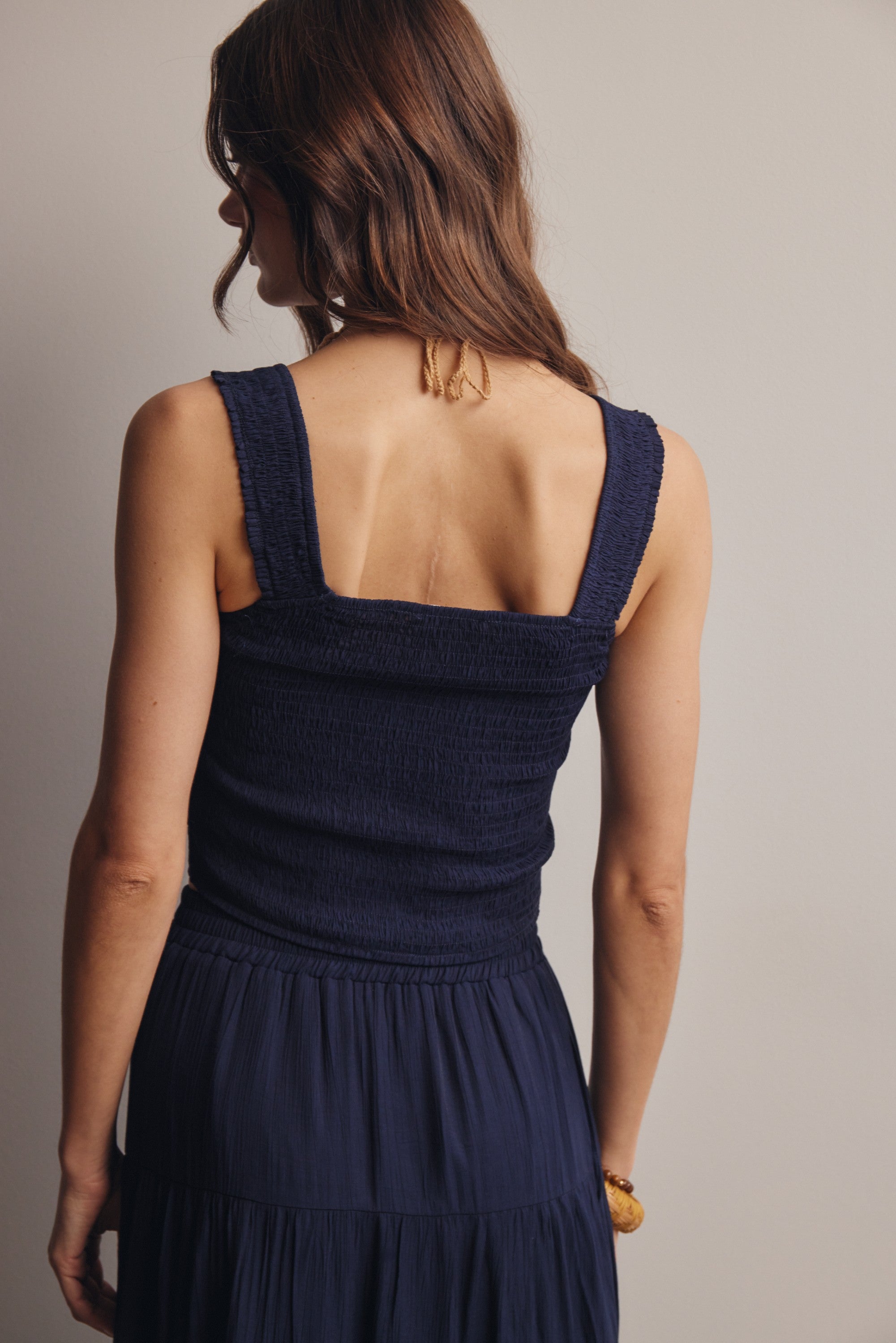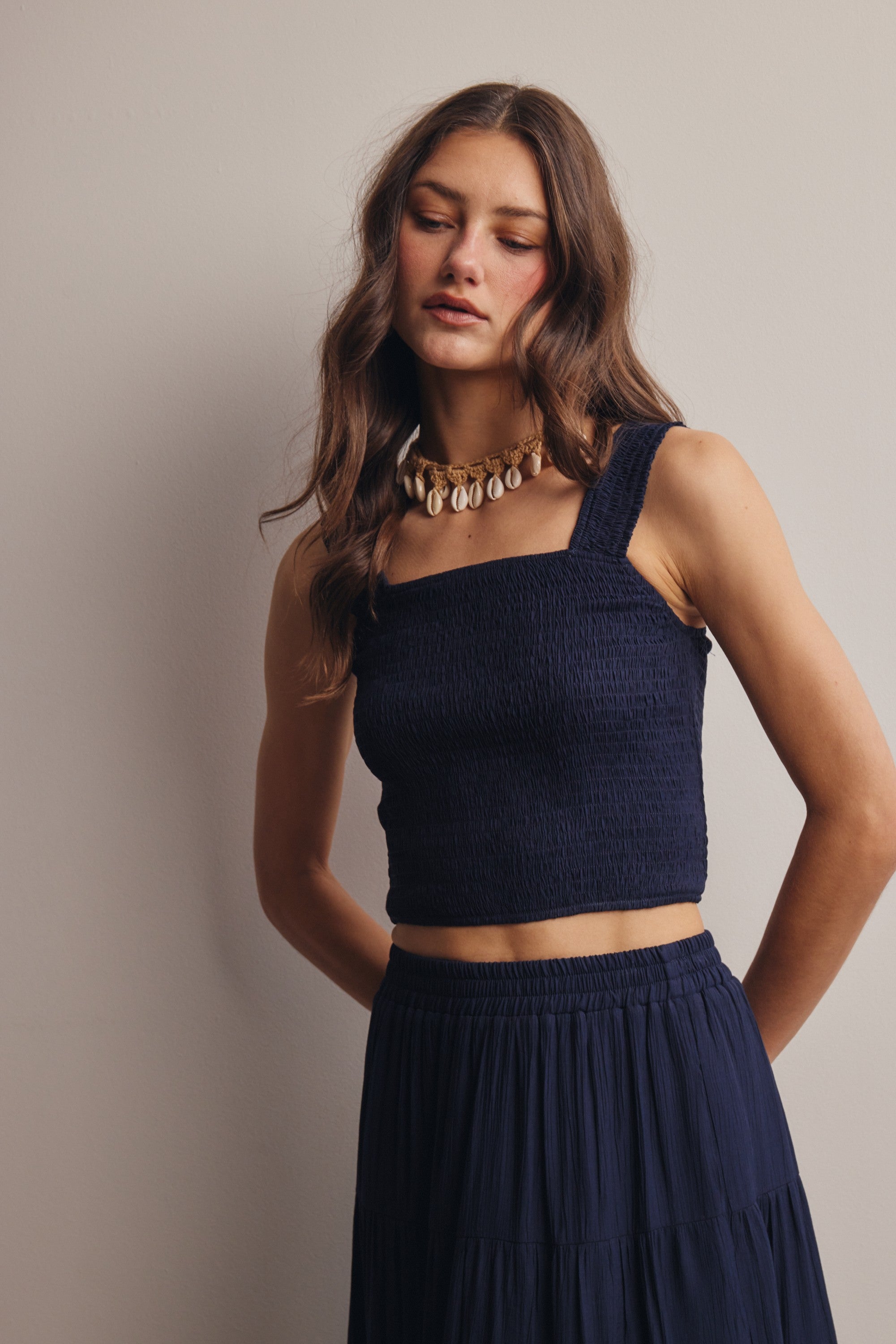 Discover effortless elegance with the East Coast Top, crafted from soft woven fabric that feels as good as it looks. The allover smocking creates a flattering, body-hugging silhouette while wide shoulder straps and a squared neckline deliver modern sophistication. A gently ruffled hem adds feminine charm, while the cropped length pairs perfectly with high-waisted bottoms for versatile, on-trend styling. Light, comfortable, and undeniably chic—this is the top you'll reach for again and again.