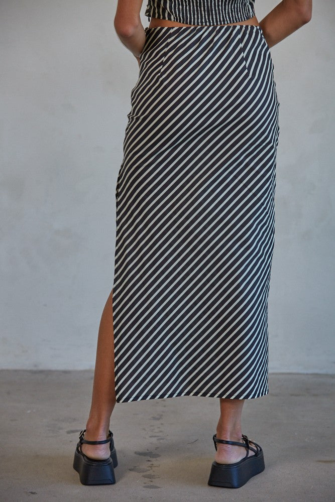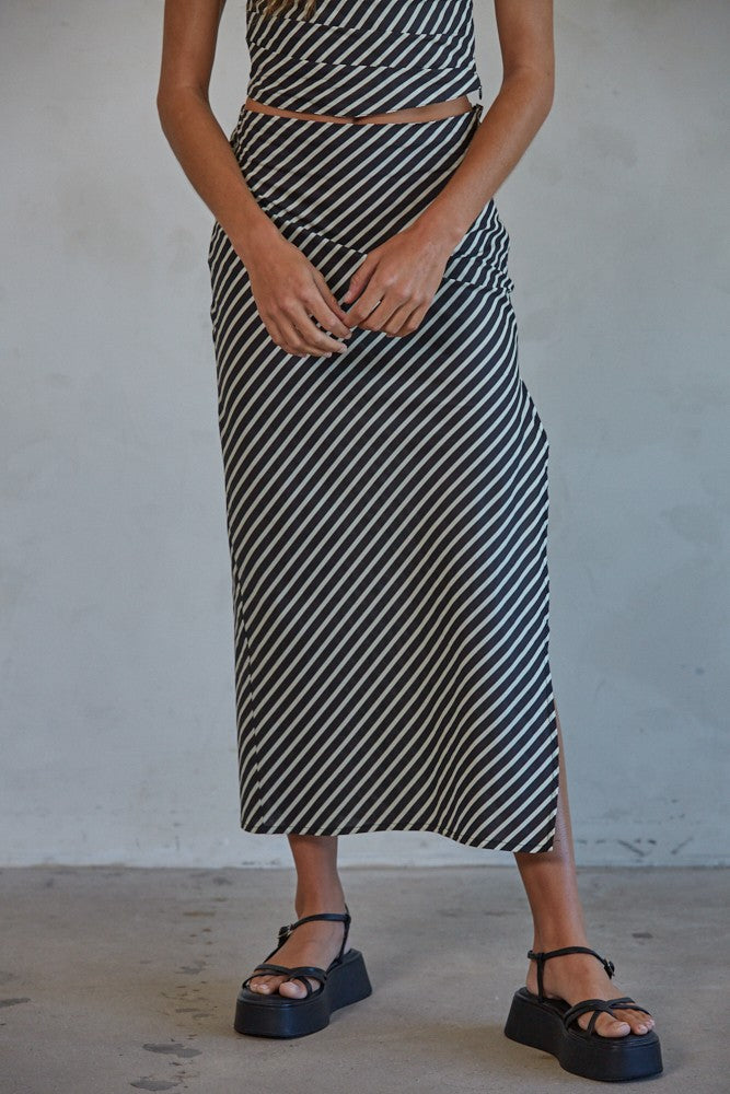 Elevate your style effortlessly with the Harbor Stripe Midi Skirt. Crafted from woven cotton, its classic striped print and side slit enhance both comfort and movement. Featuring a back waist elastic and optional side zipper, this pencil skirt contours your silhouette beautifully while ensuring a perfect fit. Ideal for day-to-night wear, it’s a versatile piece that combines timeless design with practical details.