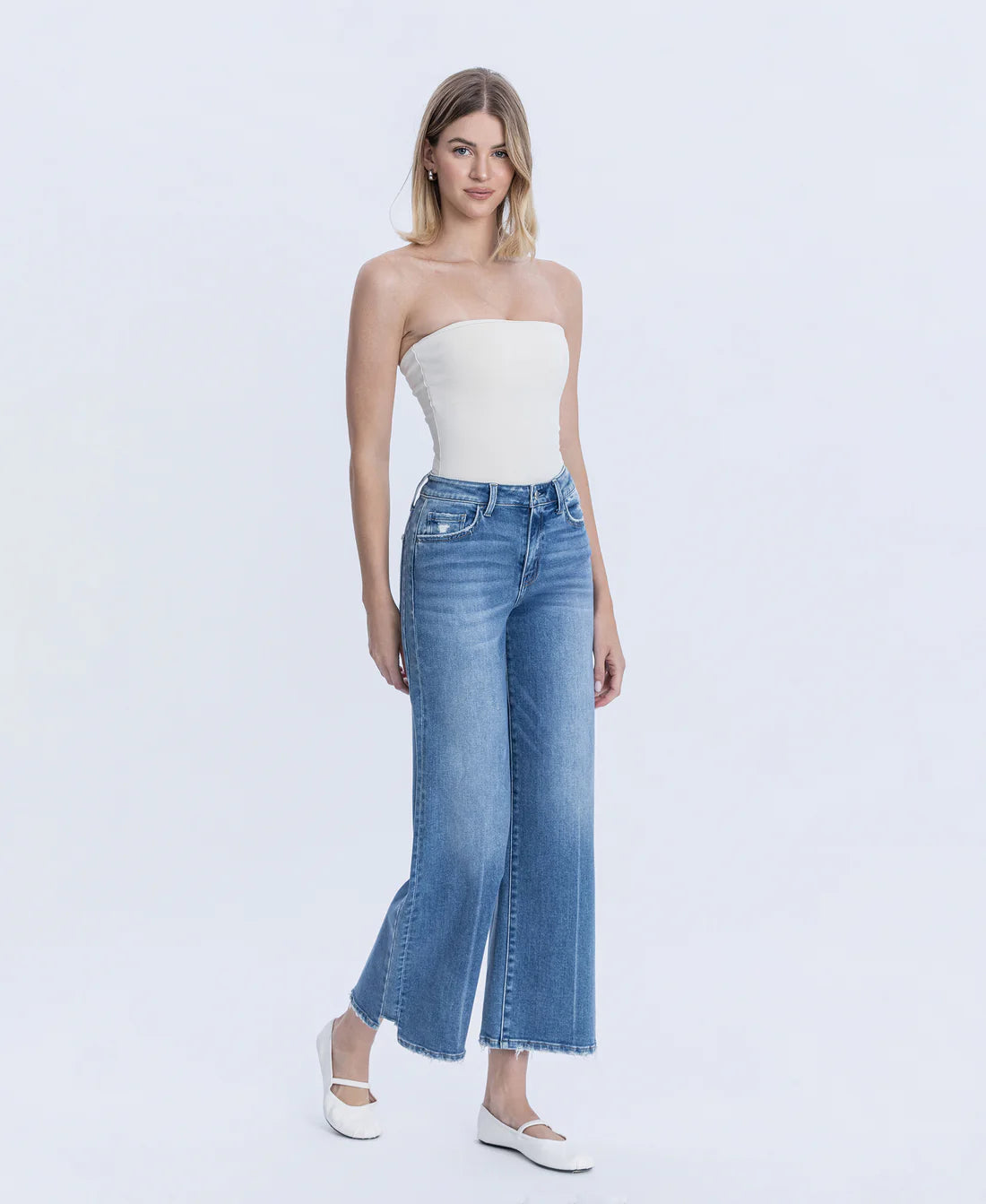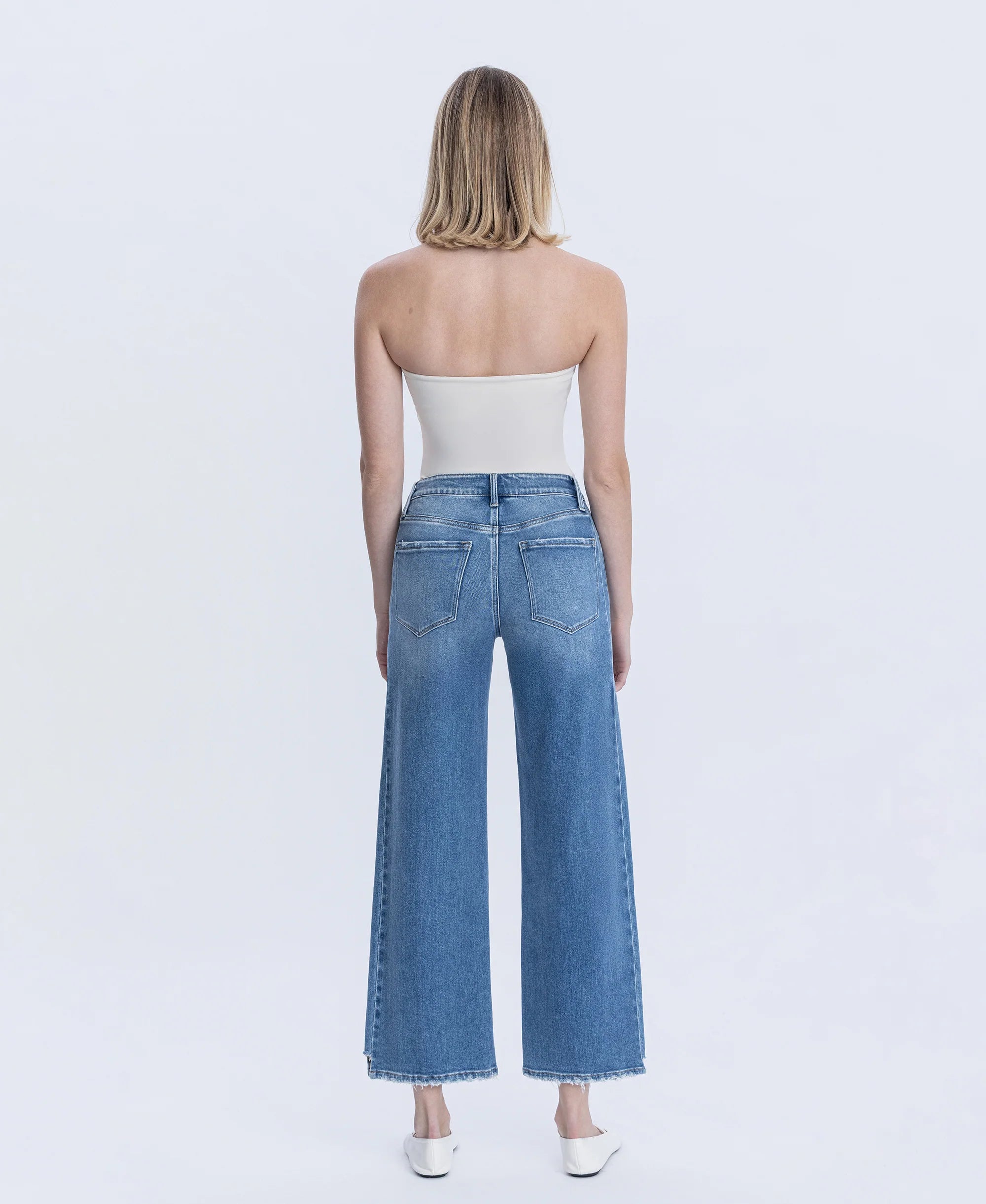 High Rise Side Panel Wide Leg Jeans Elevate your denim collection with these versatile wide leg jeans crafted for modern comfort and timeless style. Featuring a flattering high rise waist, medium dark wash, and an on-trend step hem at the ankle, these jeans deliver a polished yet relaxed silhouette. The side panel construction ensures a smooth fit through the hips and thighs. Perfect for creating effortless everyday looks or dressing up for any occasion.