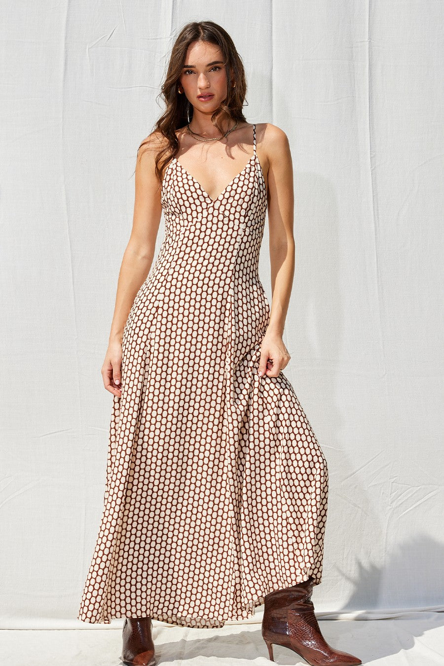 Elevate your style with the Honeycomb Chic Maxi Dress, featuring a flattering plunging V-neckline and an elegant open back secured with a delicate tie and tassels. Crafted with a coconut button closure and sleeveless design, this lined dress offers comfort and sophistication. Practical side pockets add convenience without sacrificing style, making it perfect for any occasion.