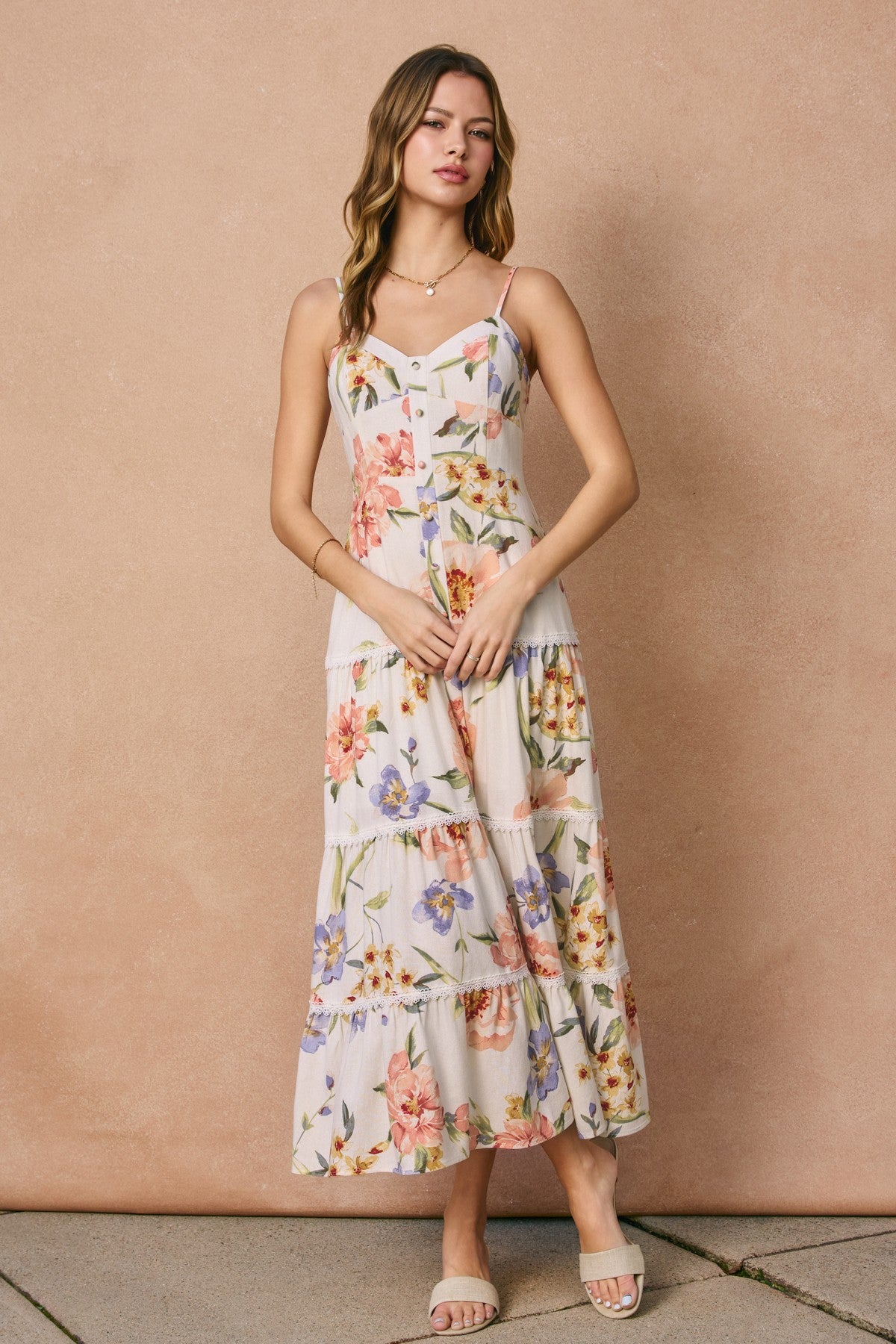 Embrace effortless elegance with the Honeysuckle Drift Midi Dress, a romantic piece that seamlessly transitions from day to evening. Crafted from a breathable rayon linen blend, this midi features a flattering V-neckline and thoughtfully placed bodice paneling that creates a refined silhouette. Delicate lace details add vintage-inspired charm, while the decorative button placket enhances the dress's sophisticated appeal. Perfect for garden parties, brunch dates, or casual outings, this floral-printed beauty offers comfort without compromising on style. The relaxed drape of the fabric ensures all-day wearability. Model is 5'7" wearing size Small.