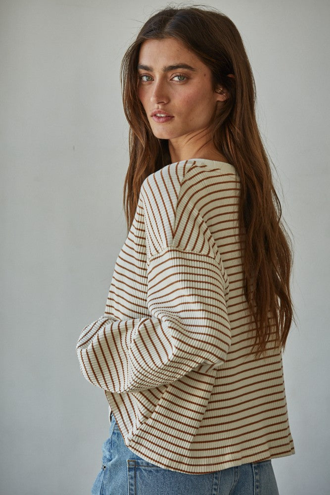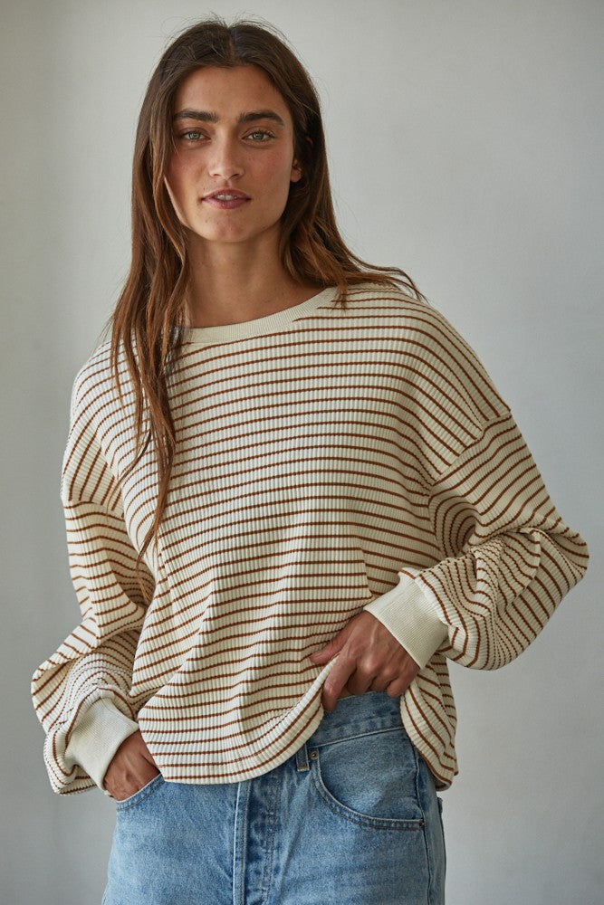 Experience everyday comfort with the Horizon Lines Top, crafted from a soft knit blend of cotton and spandex for a flattering stretch. Its stylish striped and ribbed texture adds subtle depth, while the classic crew neck and long sleeves make it a versatile choice for layering or wearing alone. Perfect for effortless style that moves with you throughout the day.
