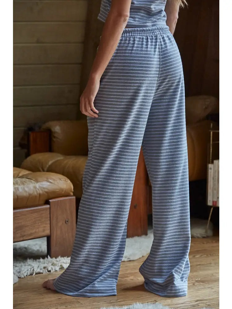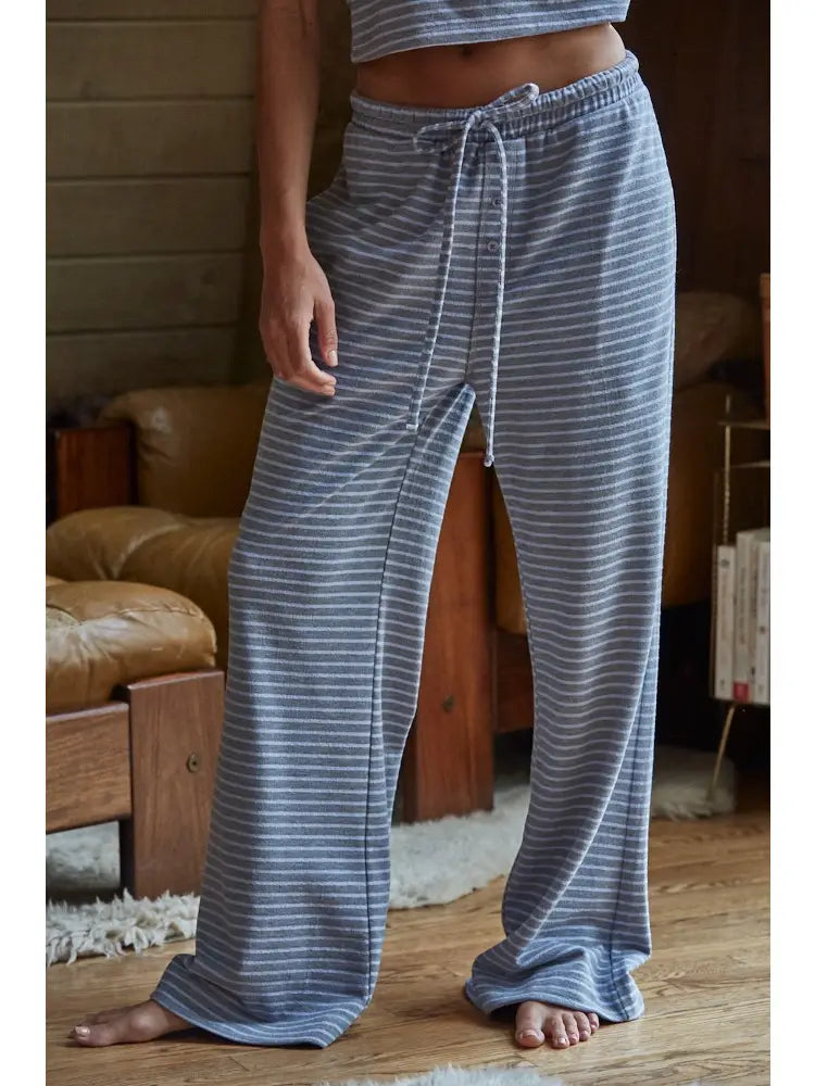 These Sunday Stripes Pants combine comfort and style with their soft knit polyester cotton blend. Featuring a flattering flare silhouette, side pockets for convenience, and a waist tie strap for a customizable fit, they offer both practicality and elegance. The unique J stitch buttons add a subtle, stylish detail, making these pants perfect for casual outings or relaxed weekends. Elevate your wardrobe with this versatile and chic piece. Pairs perfectly with the Sunday Stripes Top!