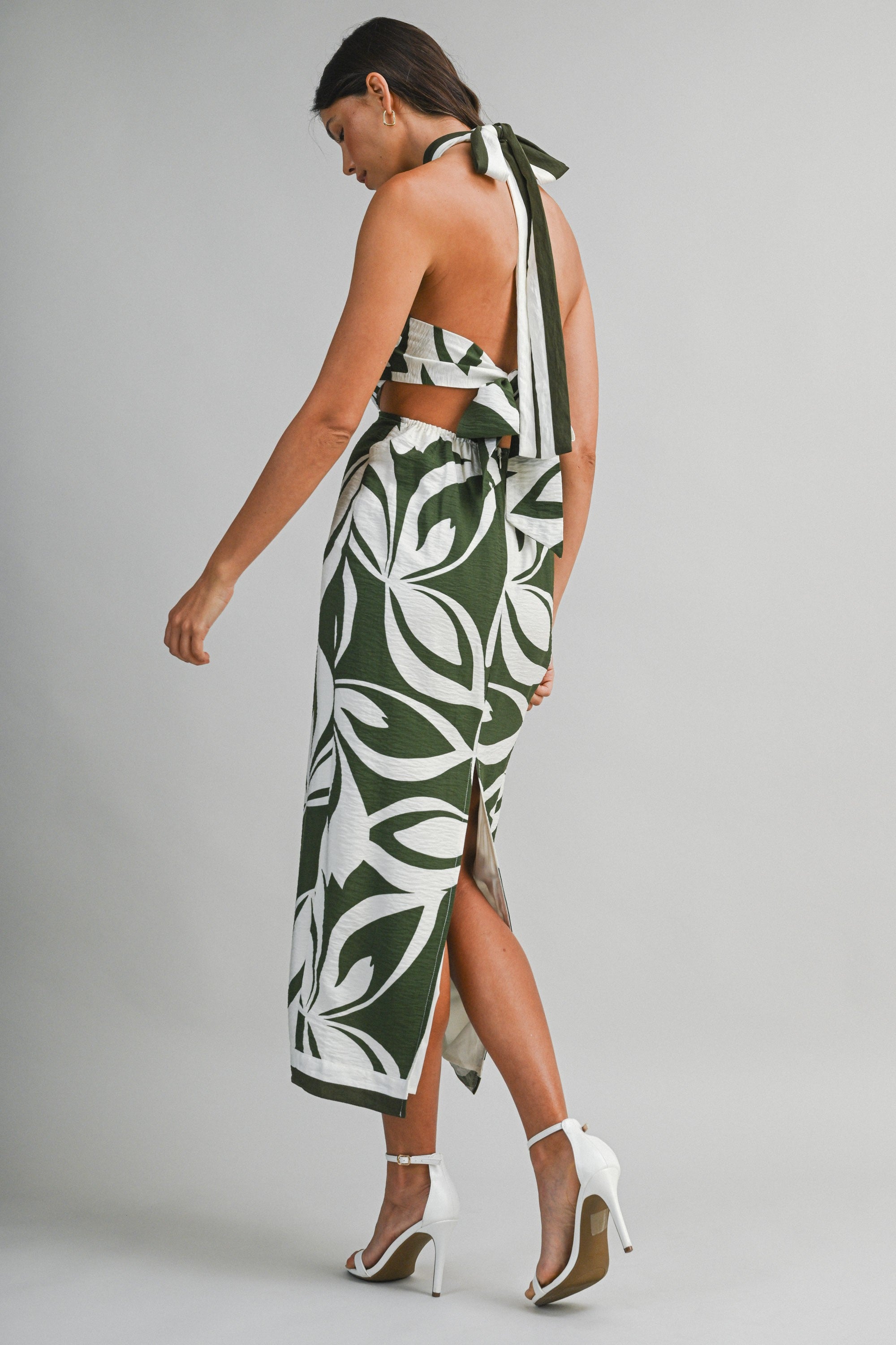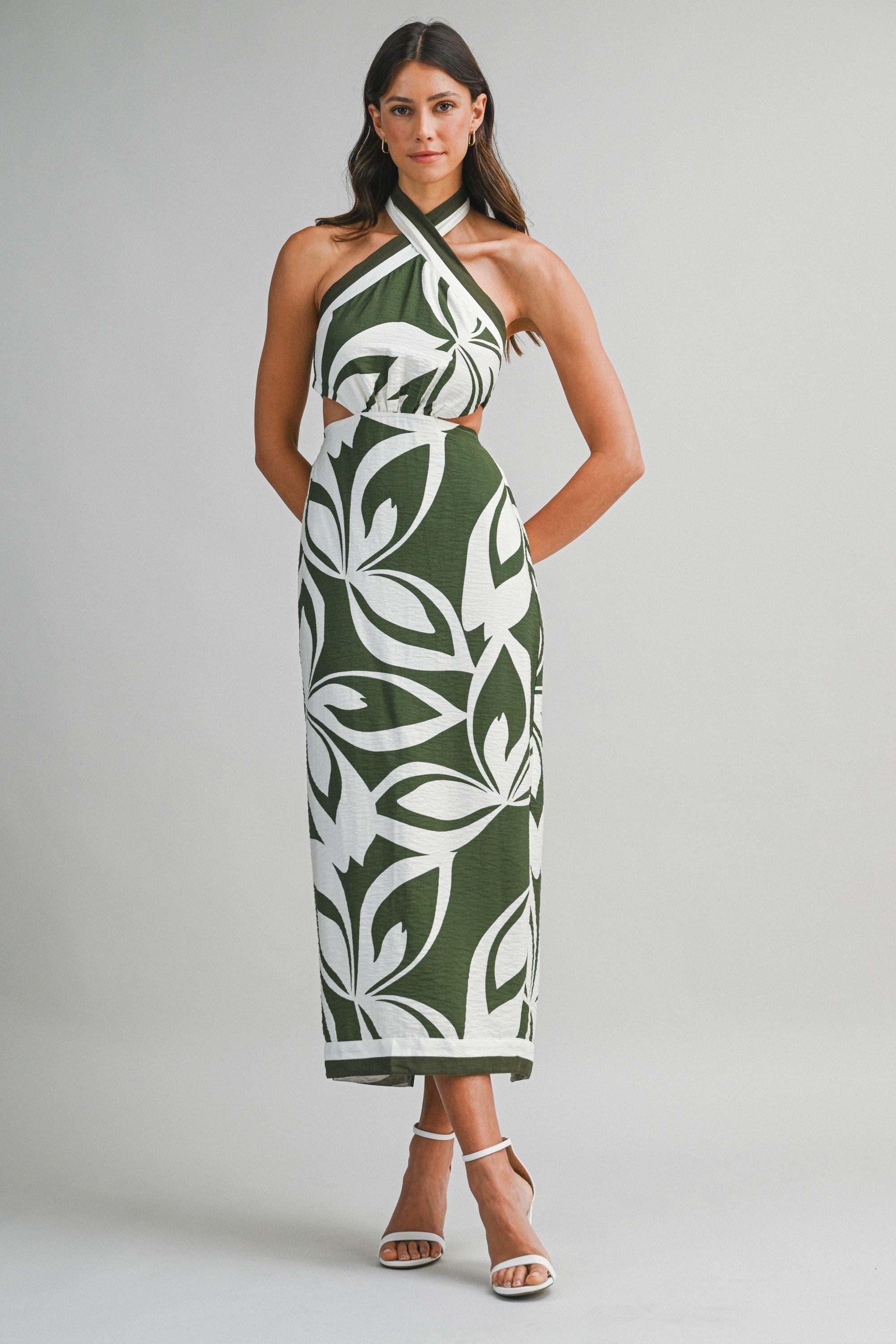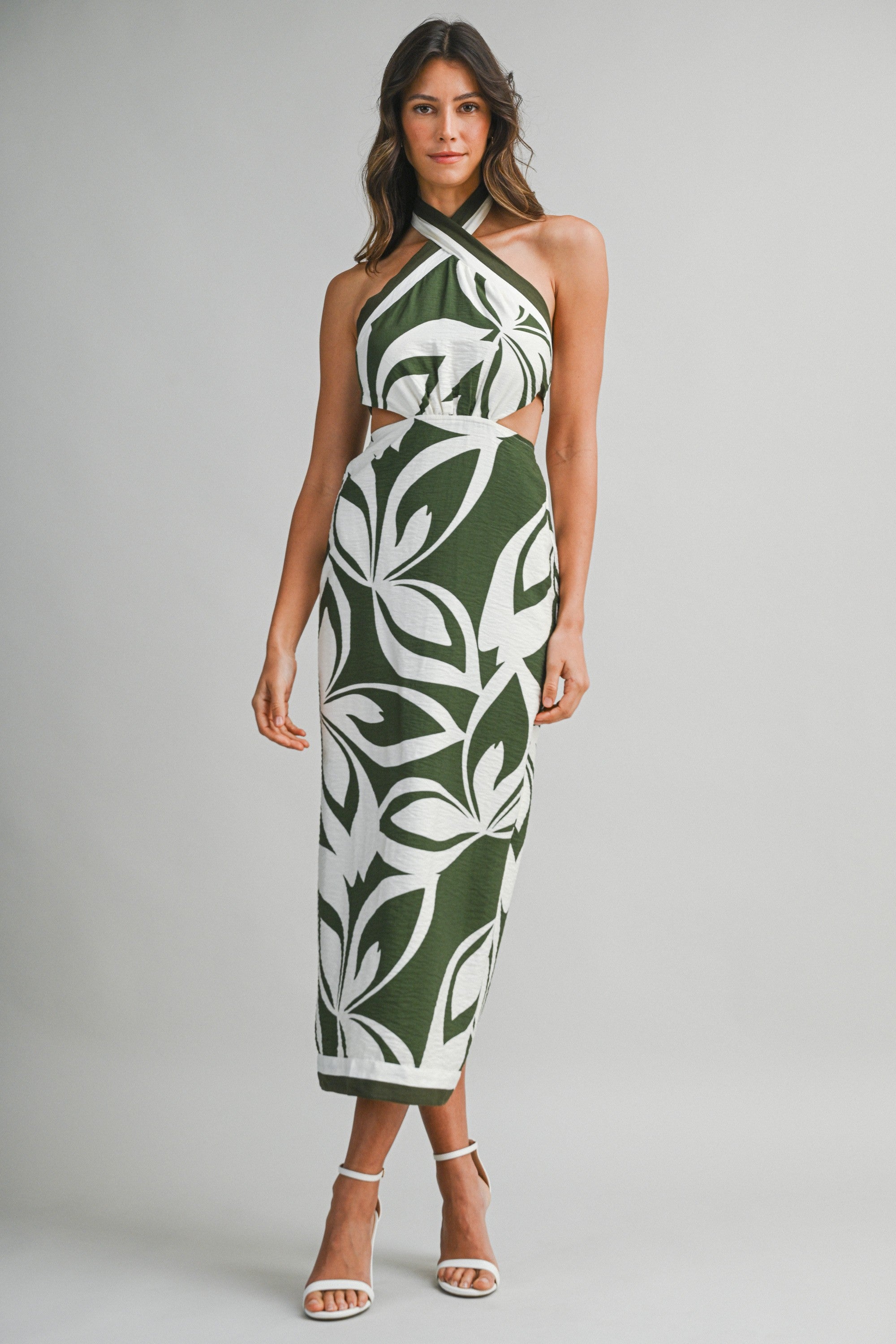 Escape to paradise with the Island Soul Midi Dress, where tropical elegance meets modern sophistication. This stunning piece features a flattering criss-cross halter neckline and daring open back with a self-tie detail that commands attention. The midi silhouette flows beautifully with a subtle back slit for effortless movement, while the side invisible zipper ensures a seamless fit. Fully lined for comfort and confidence, this dress transitions seamlessly from beachside getaways to evening occasions!