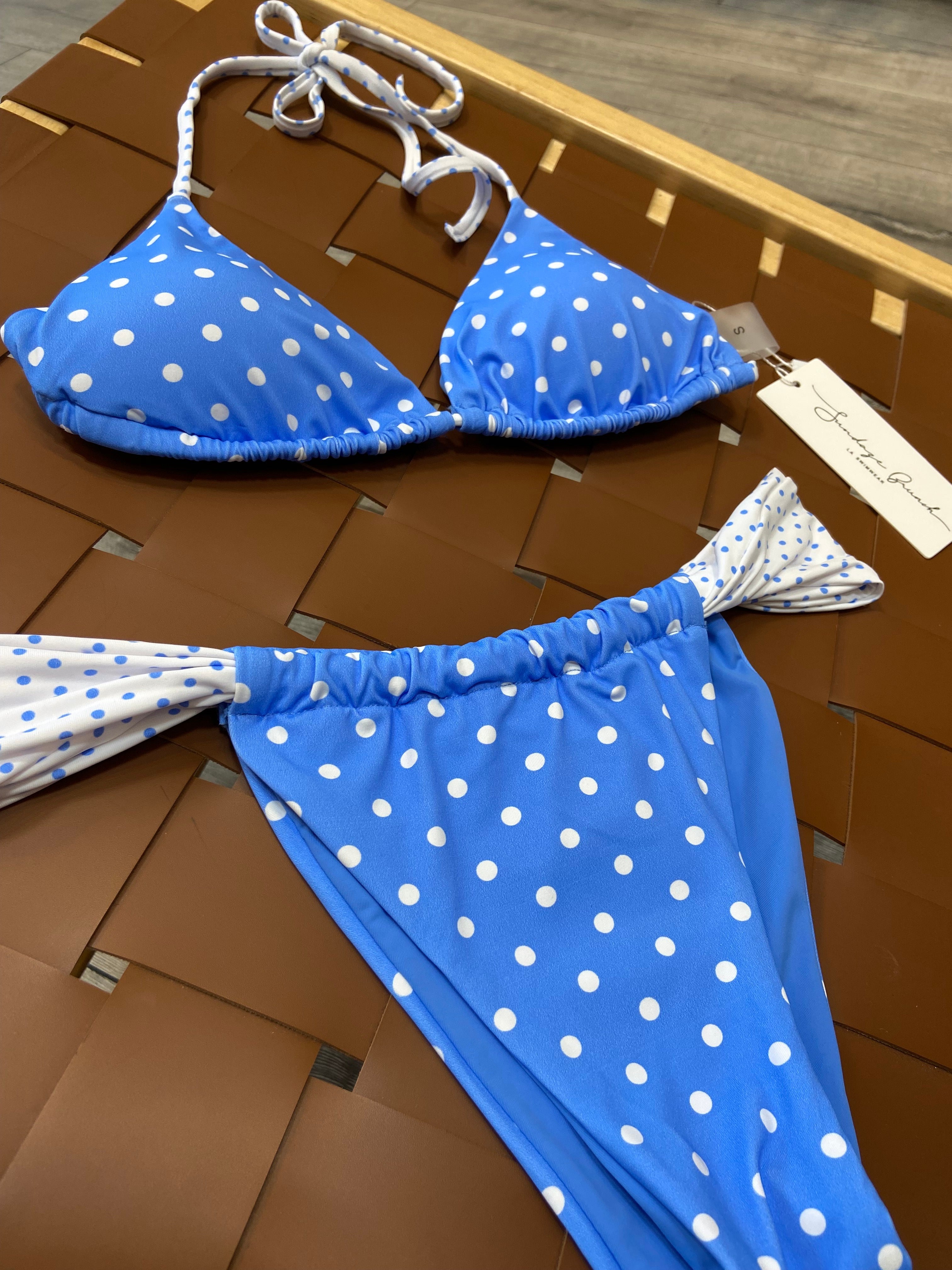 Make a splash this season in our Italian Summer Bikini Set, featuring a vibrant cornflower blue base adorned with crisp white polka dots. The classic sliding triangle top pairs perfectly with ruched back bottoms, creating a flattering silhouette that moves with you. Ultra-thin spaghetti straps minimize tan lines while contrast side detailing adds visual interest. Crafted from ultra-smooth stretch swim fabric, this set offers comfort and durability in the water or by the pool. Removable padding lets you customize your coverage and support. Perfect for beach days and resort getaways.