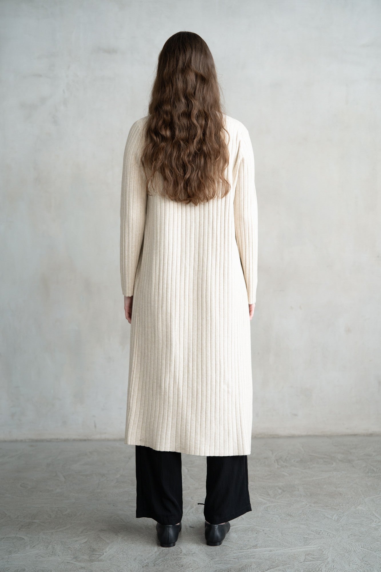 The Ivory Line Midi Dress offers a sleek, ribbed knit design that flatters your silhouette effortlessly. Featuring a button-up front with subtle tonal buttons, it can be styled as a sophisticated midi dress or worn open as a long cardigan for a versatile layered look. Its soft texture and relaxed long sleeves provide comfortable wear, making it the perfect transitional piece to elevate your style from weekday meetings to weekend outings. Embrace effortless elegance with this adaptable wardrobe essential.