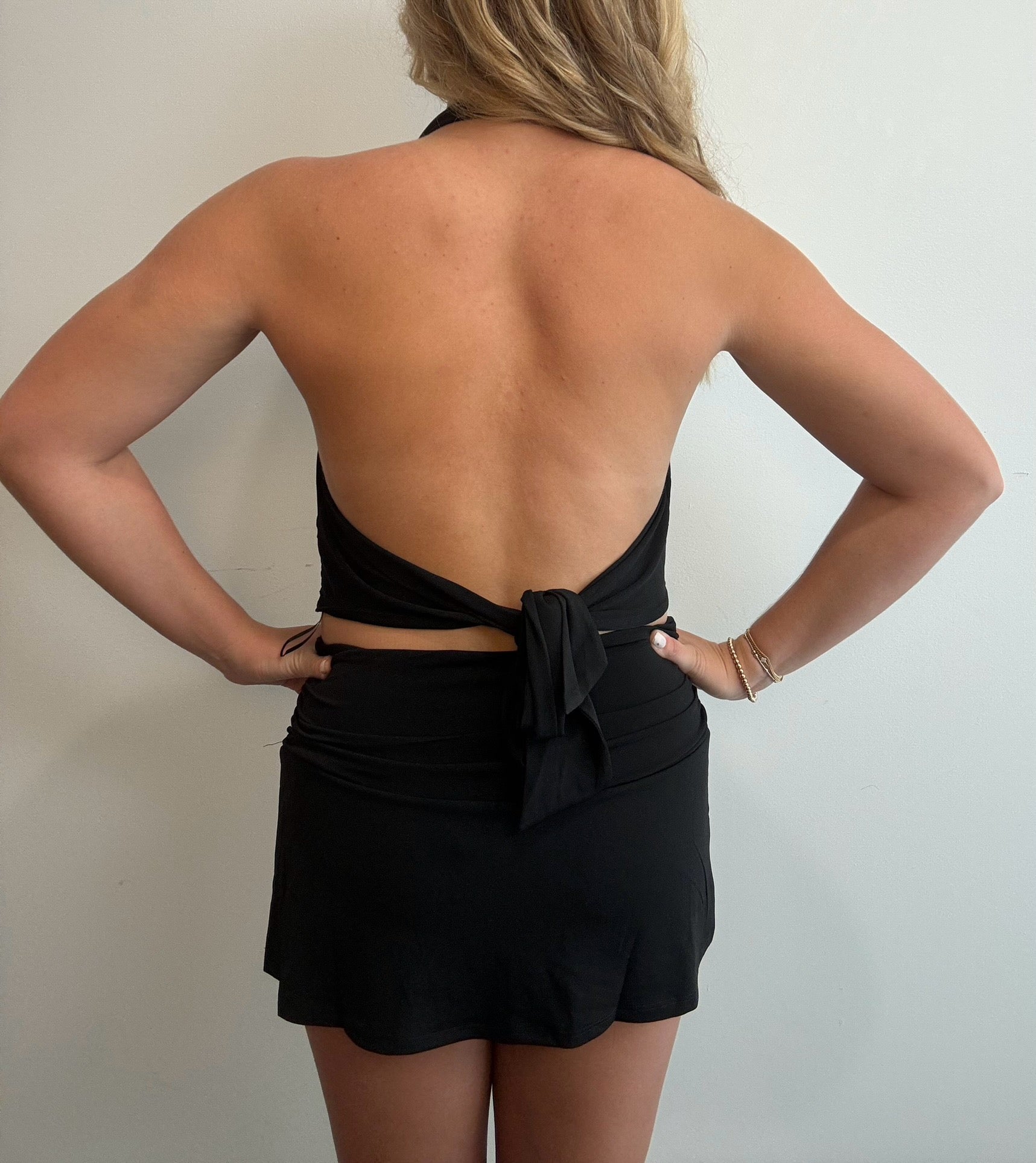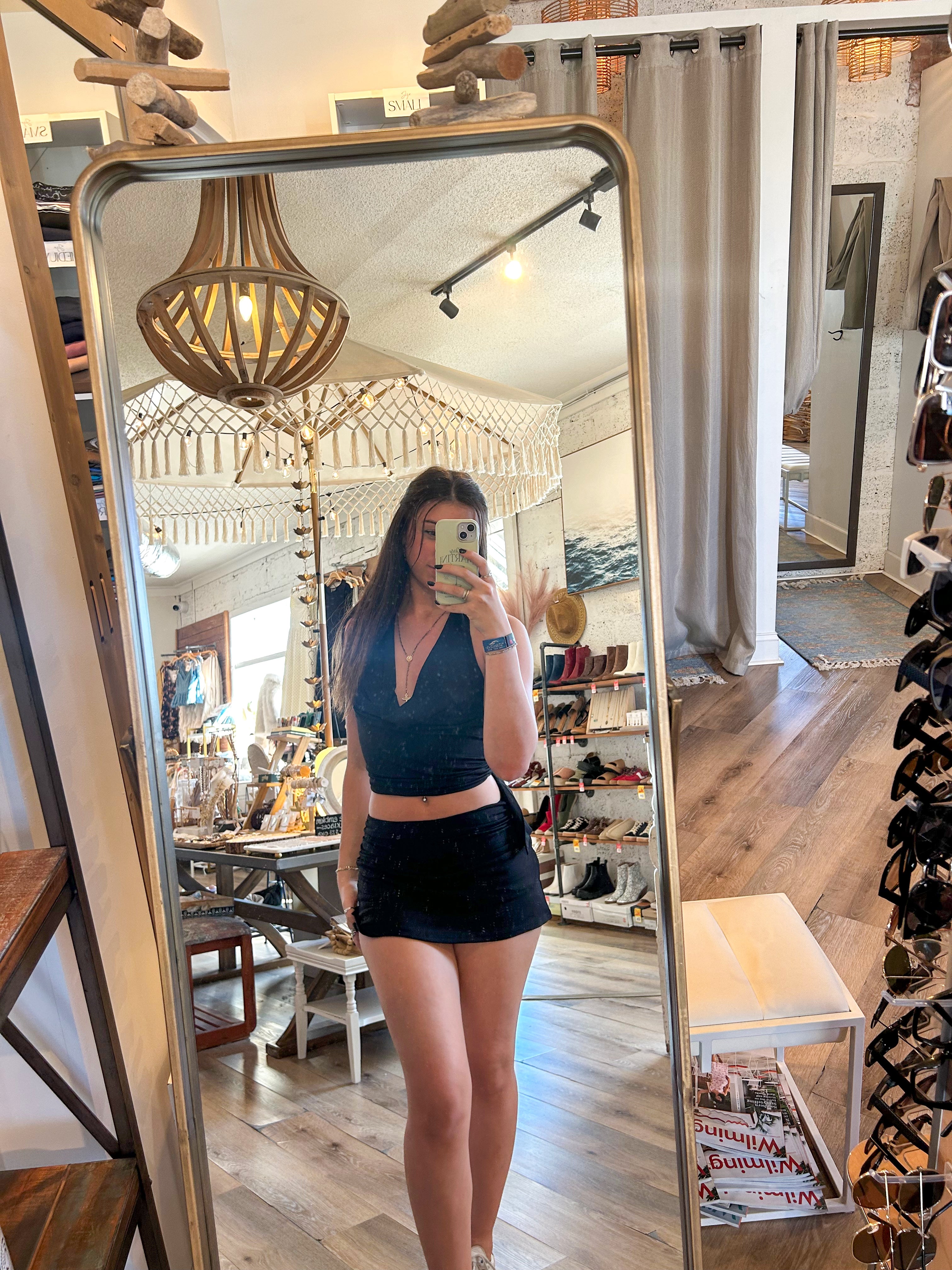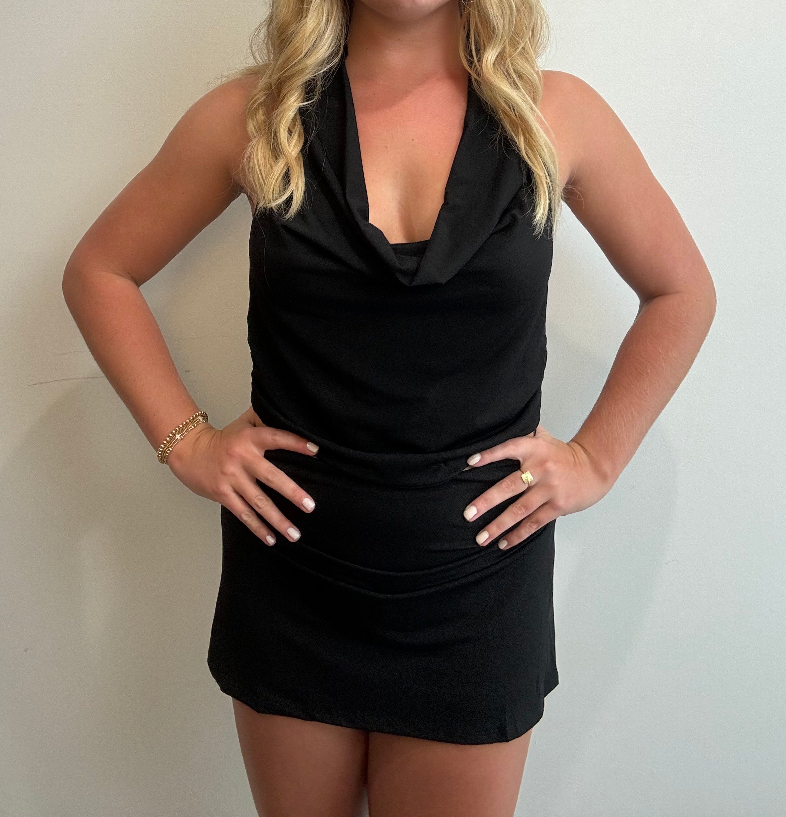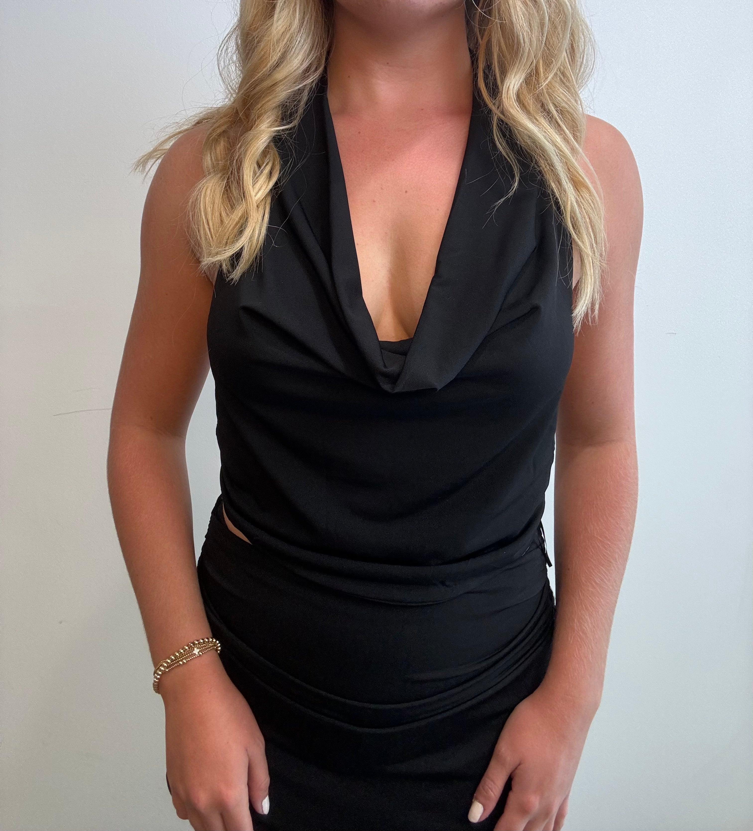 Elevate your style with the Luna Luxe Top, featuring a sleek black cowl neck and a flattering fitted silhouette. This versatile piece effortlessly balances elegance and edge, perfect for a night out or special occasion. The draped neckline and open back adds a touch of sophistication, making sure you stand out wherever you go. Pair it with the Luna Luxe Mini Skirt!