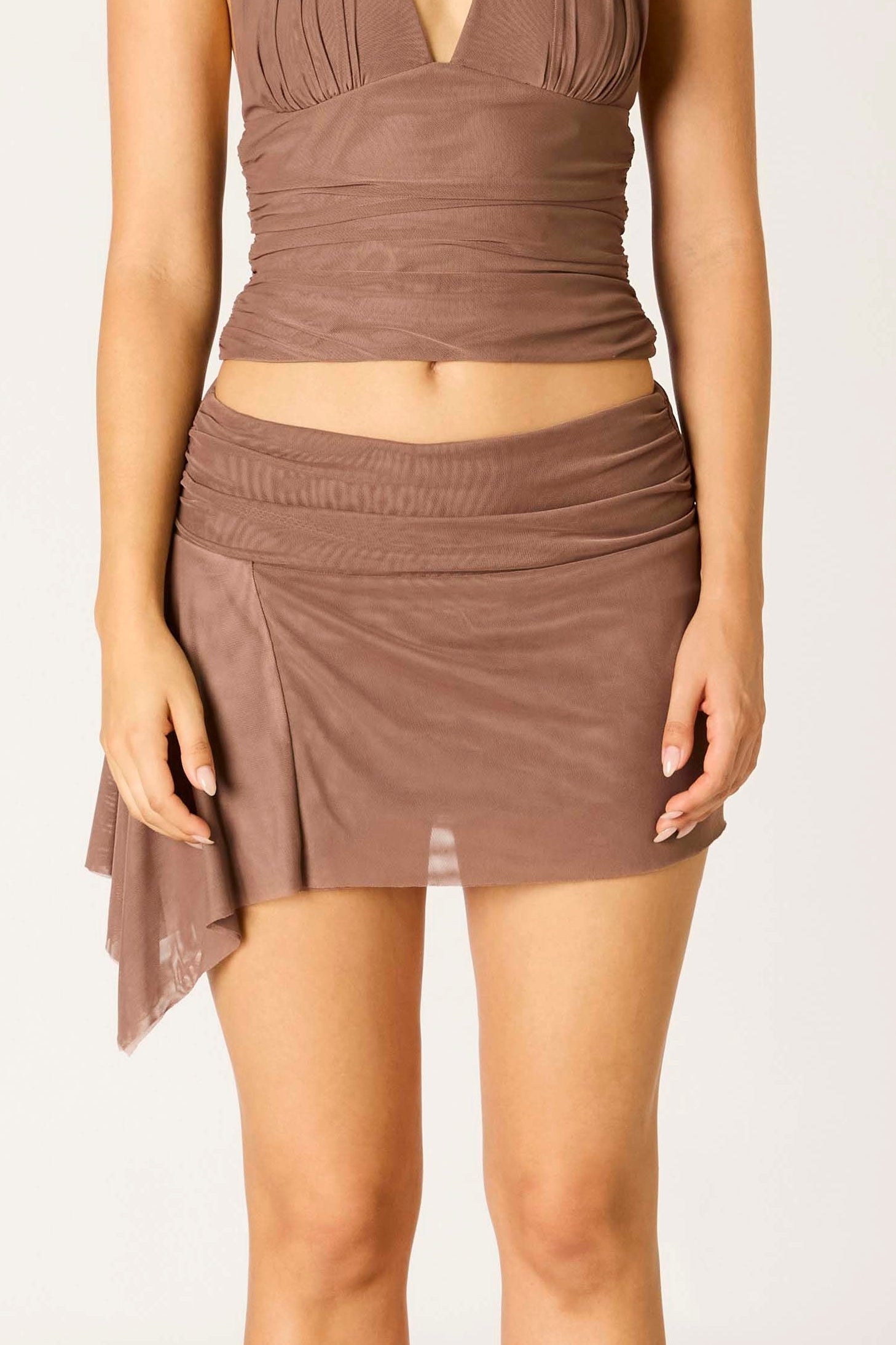 Elevate your everyday style with this mocha-toned mini skirt, designed with flattering ruched detailing that creates dimension and movement. The rich, neutral shade pairs effortlessly with basics or bold tops, making it a versatile wardrobe essential. Perfect for casual outings, date nights, or layered styling. Soft fabric drapes beautifully while the ruching adds a touch of sophistication to a timeless silhouette.