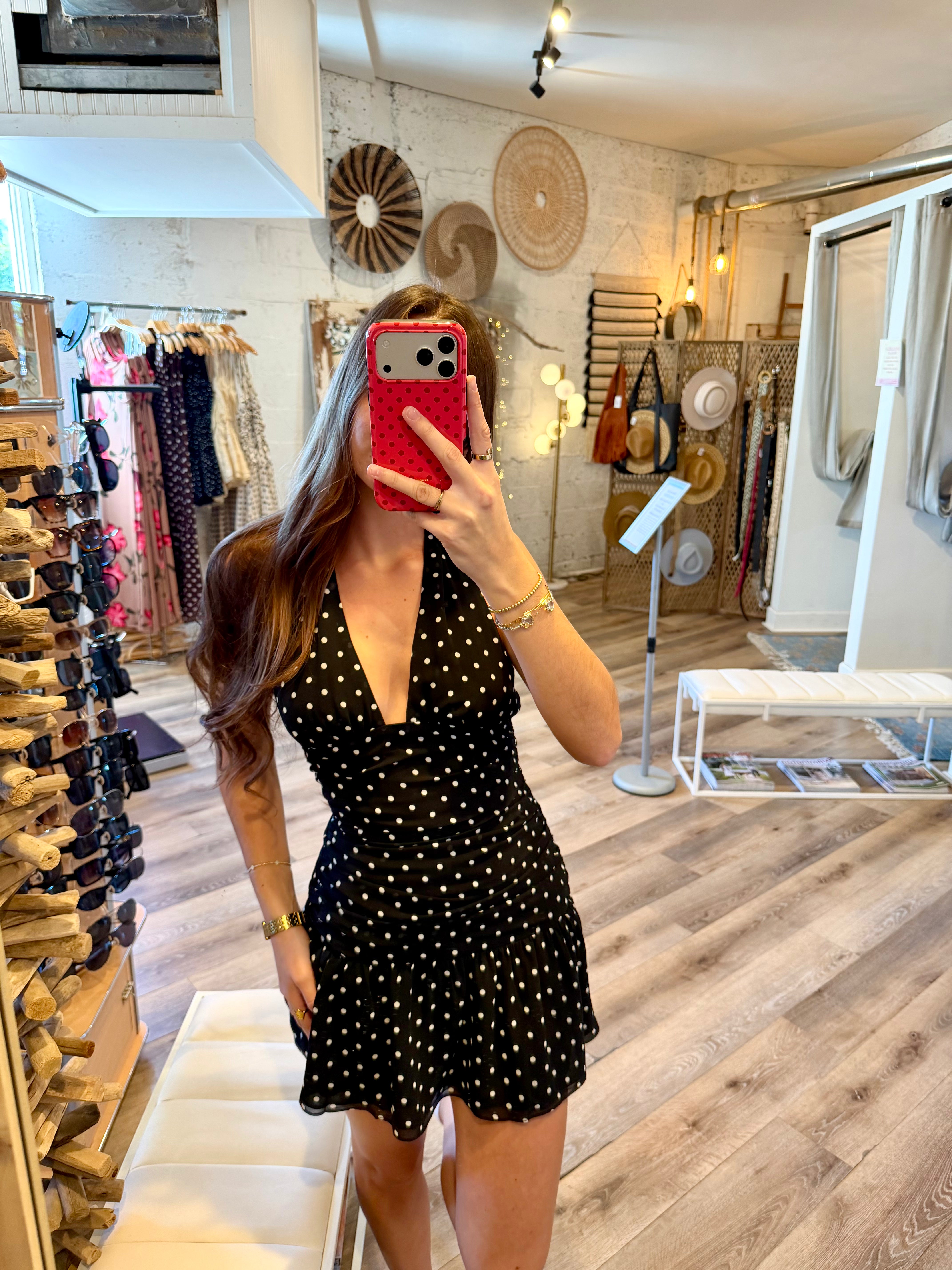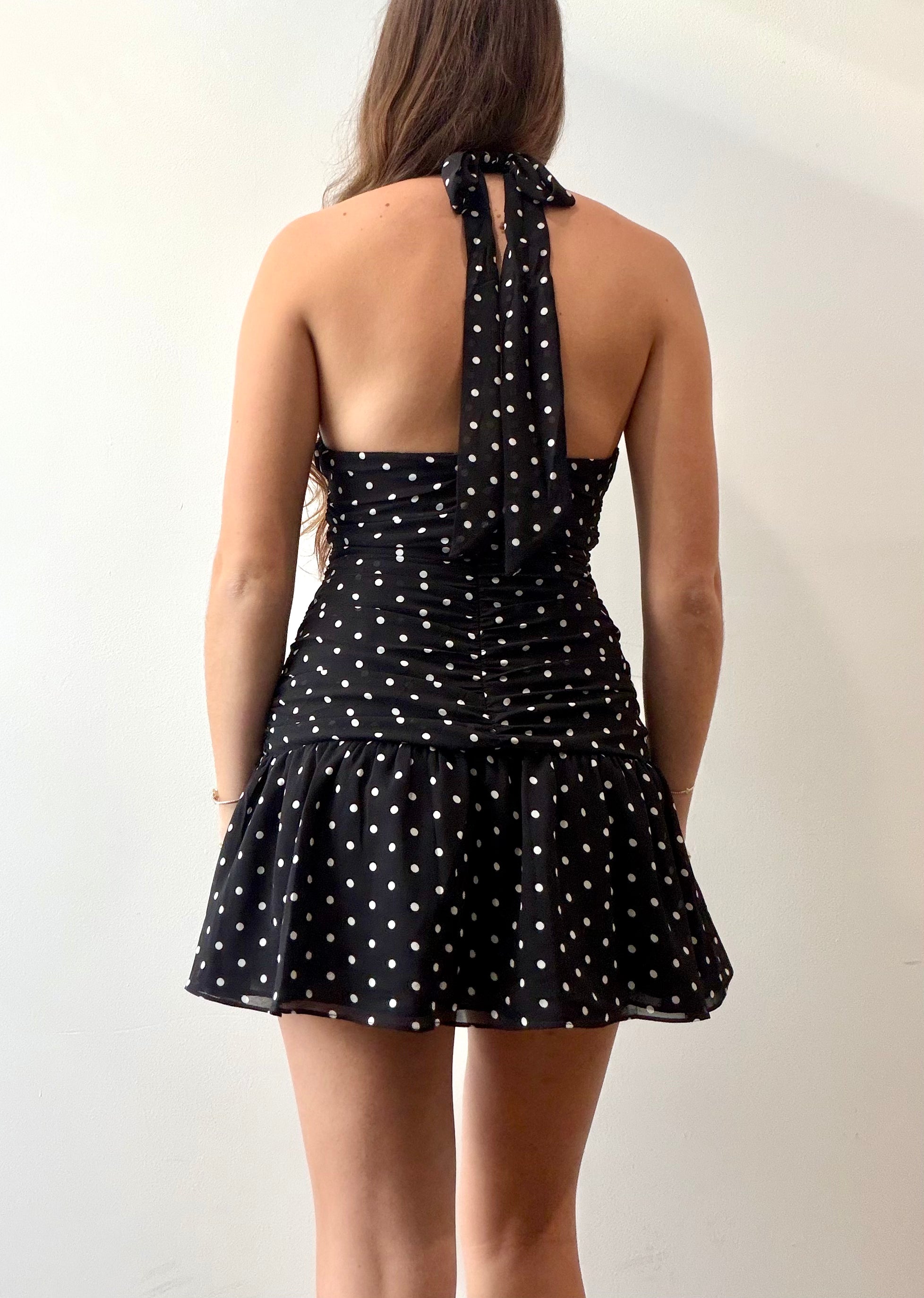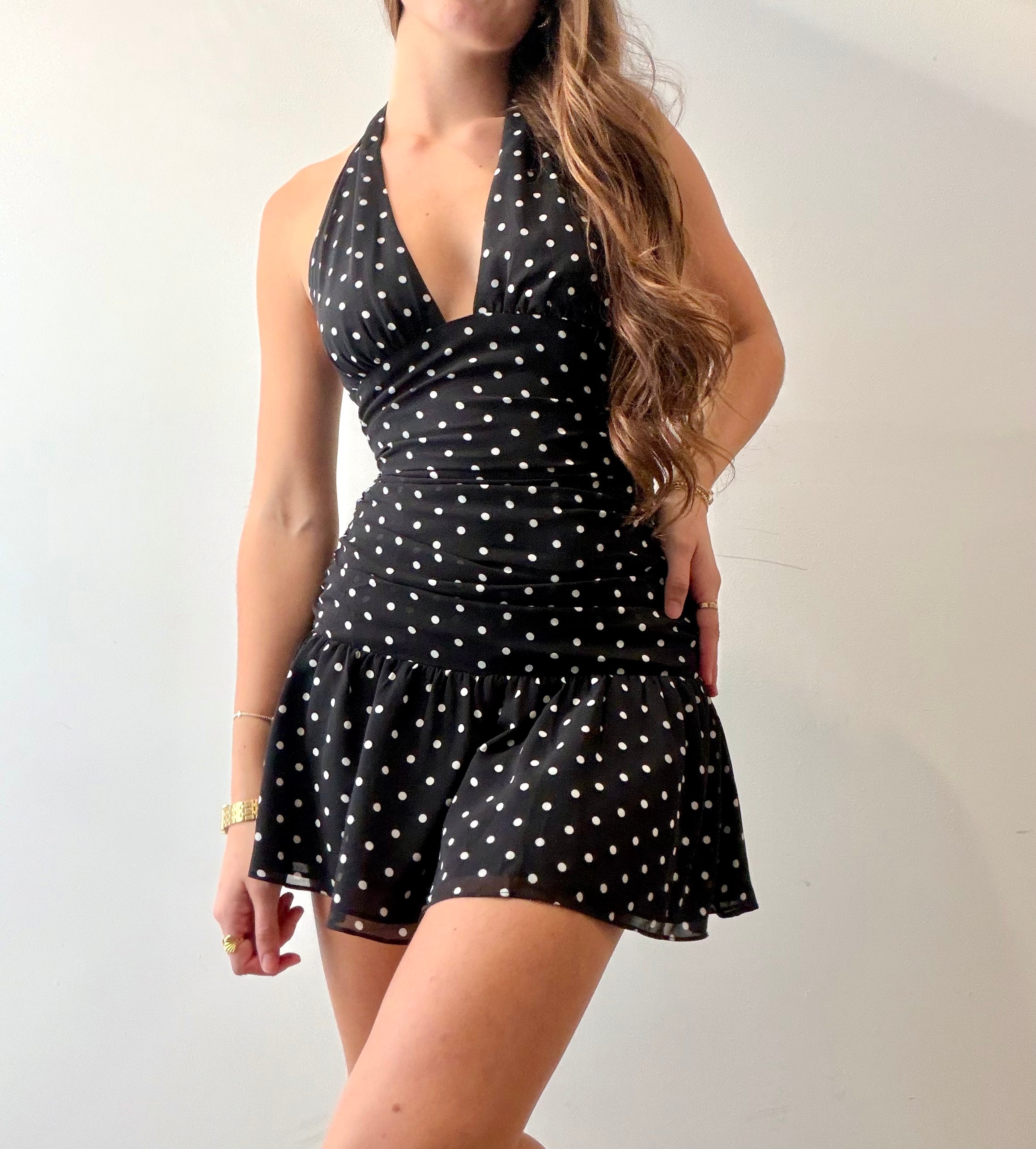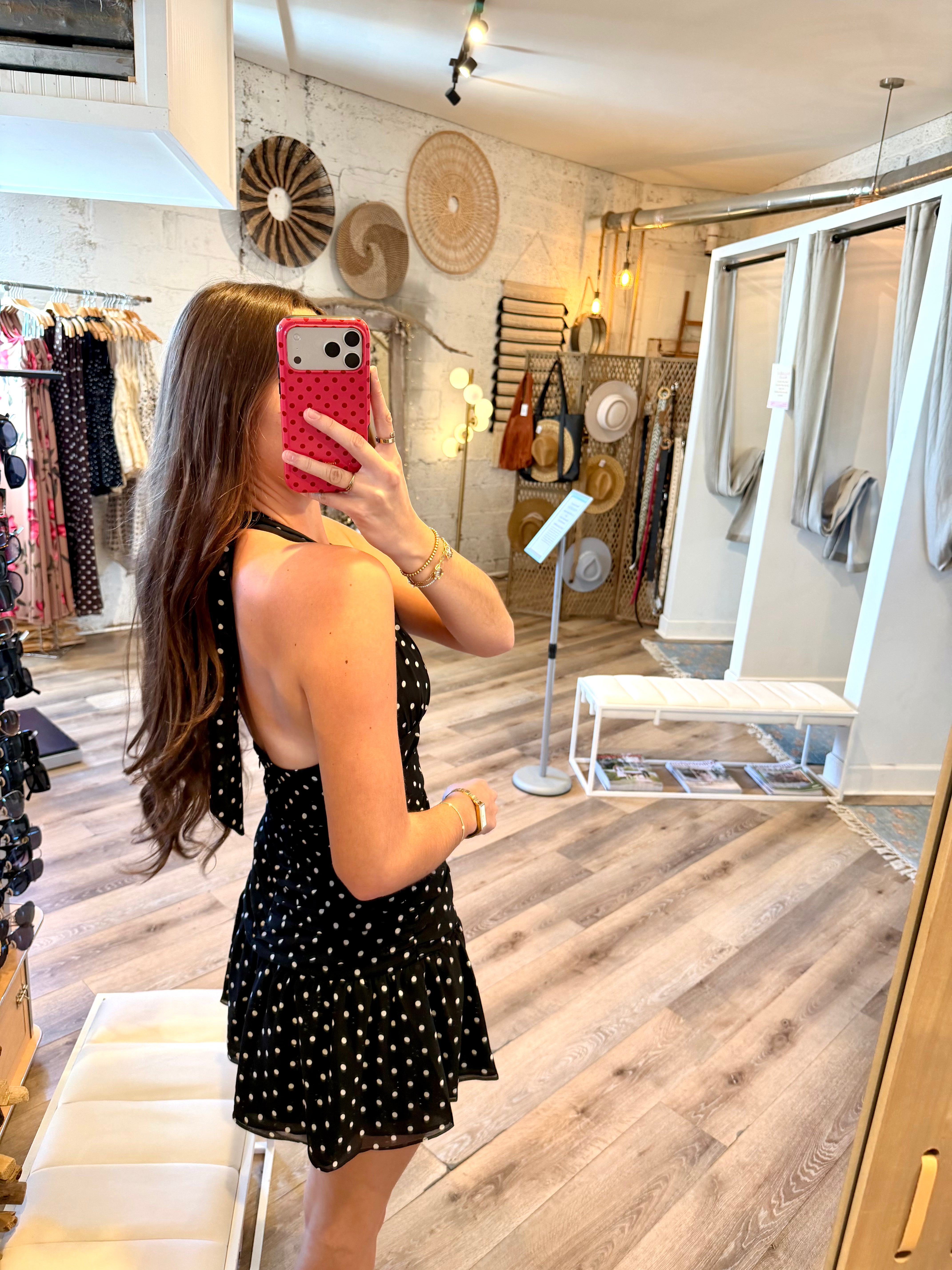 The Moonlit Dots Mini Dress combines playful charm with flattering design. Its black fabric dotted with crisp white polka dots lends timeless appeal, while the fit-and-flare silhouette beautifully defines your waist. The v-neck and halter top highlight your shoulders and neckline, and the ruffle bottom adds a flirty, feminine touch. Perfect for day or night, this dress effortlessly balances elegance and fun for any occasion.
