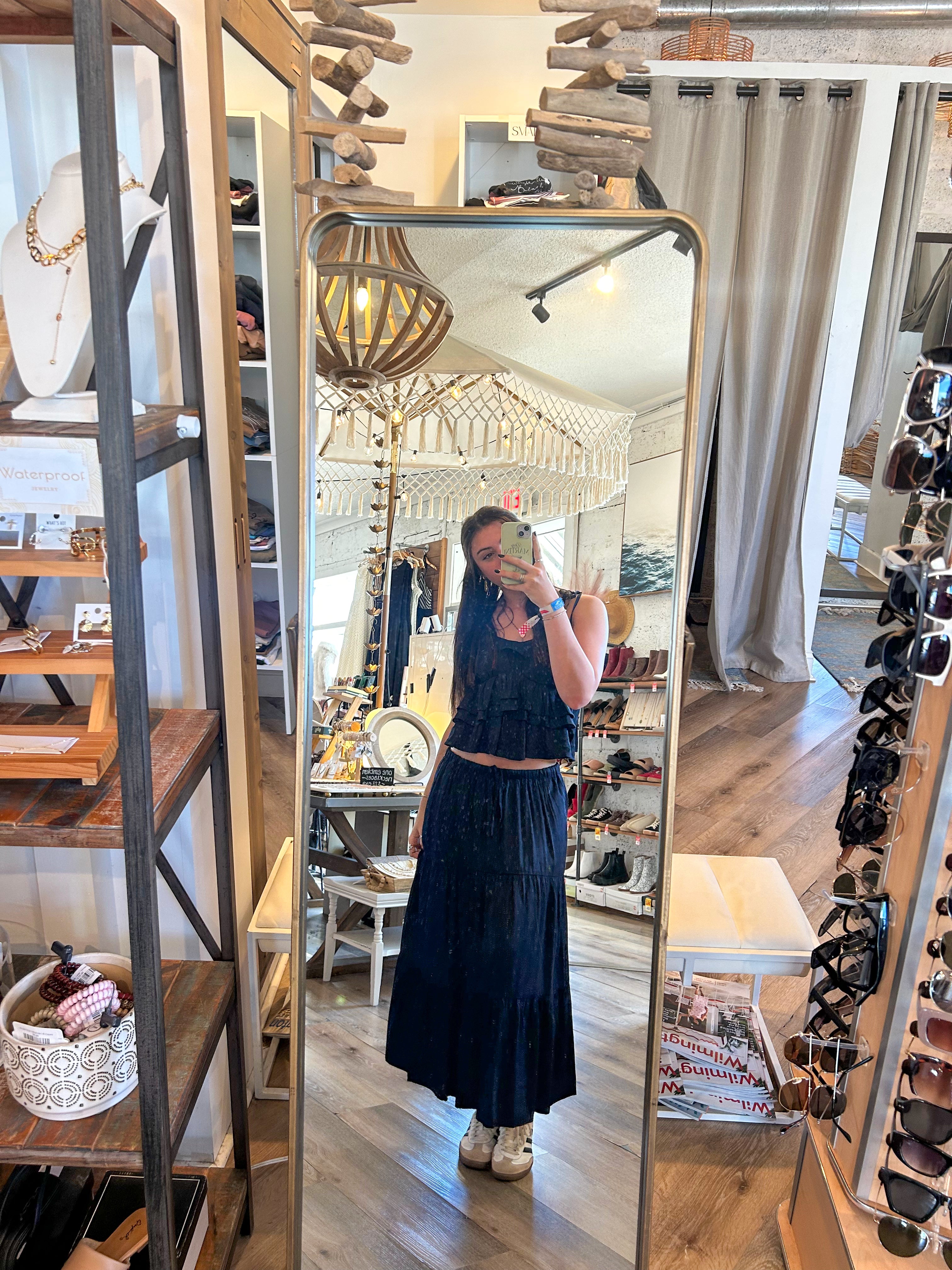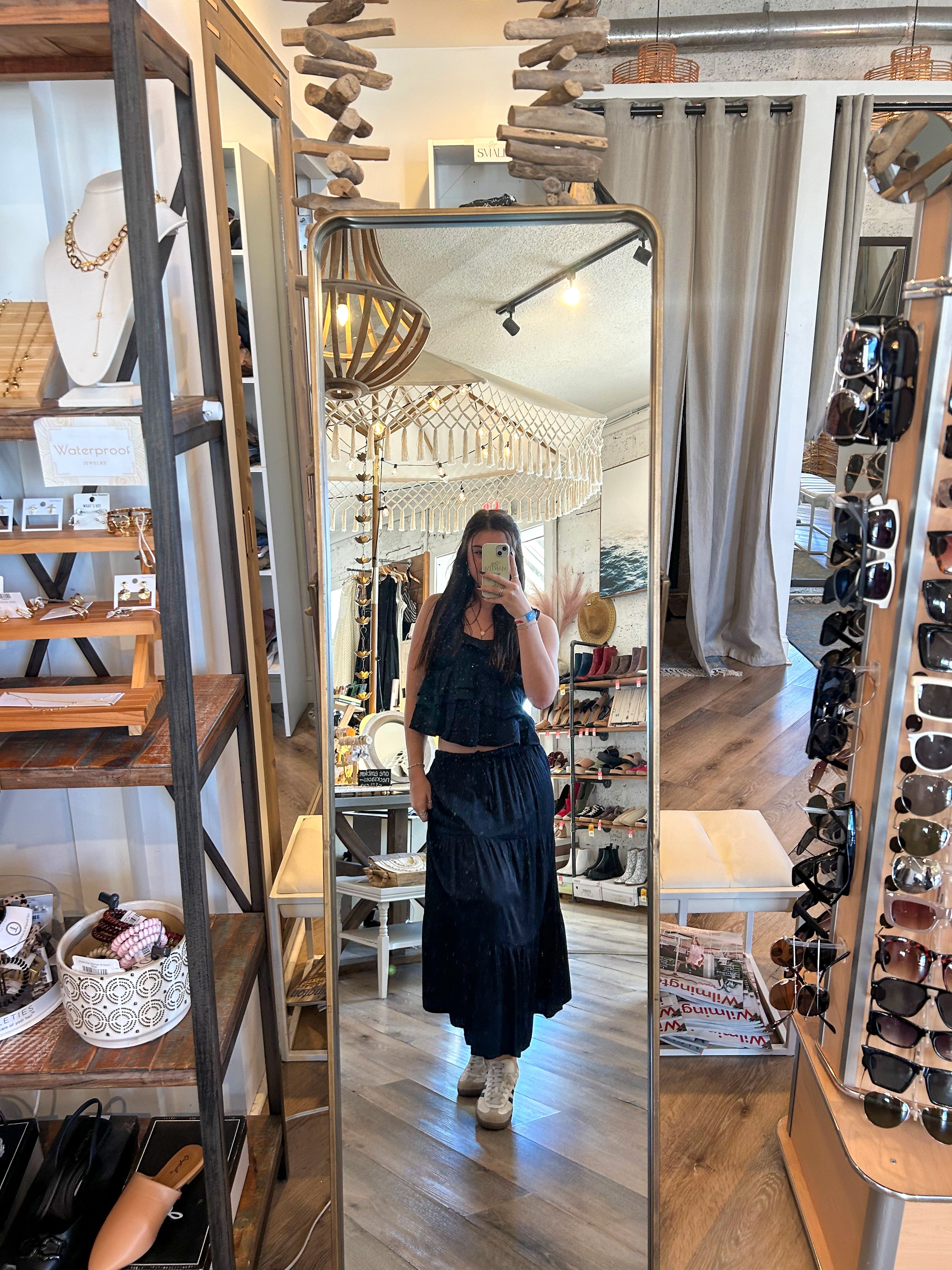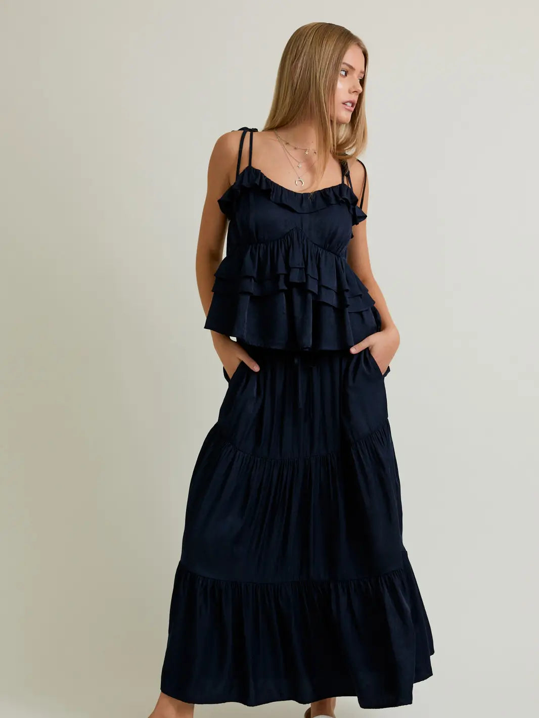 Elevate your wardrobe with the Navy Nights Maxi Skirt, featuring a flattering midwaist fit and delicate ruffle detailing. Its flowing silhouette offers effortless elegance for both casual outings and special occasions, ensuring you feel confident and stylish wherever you go. Perfect for those seeking comfort without sacrificing chic appeal. Pair it with the Navy Nights Top!