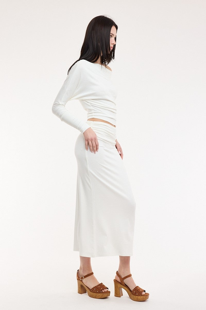 The Ocean Pearl Midi Skirt features a flattering ruched waistline that cinches and shapes your silhouette while the ankle-length cut offers timeless elegance and versatility. This crisp white midi skirt transitions seamlessly from casual daytime looks to evening occasions. The ruching detail adds dimension and visual interest, making it a wardrobe staple that pairs effortlessly with everything from fitted tops to oversized blouses. Perfect for creating polished, put-together outfits year-round.