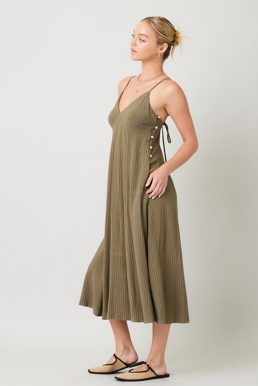 Effortless elegance meets thoughtful design in this linen striped midi dress. Crafted from breathable linen fabric, it features a flattering V-neckline and sleeveless silhouette perfect for warm-weather styling. The side coconut button closure and functional side pockets add practical charm, while the decorative shoulder strap back tie with beads creates a unique focal point. Fully lined for comfort and confidence. An ideal piece for casual outings or relaxed gatherings.