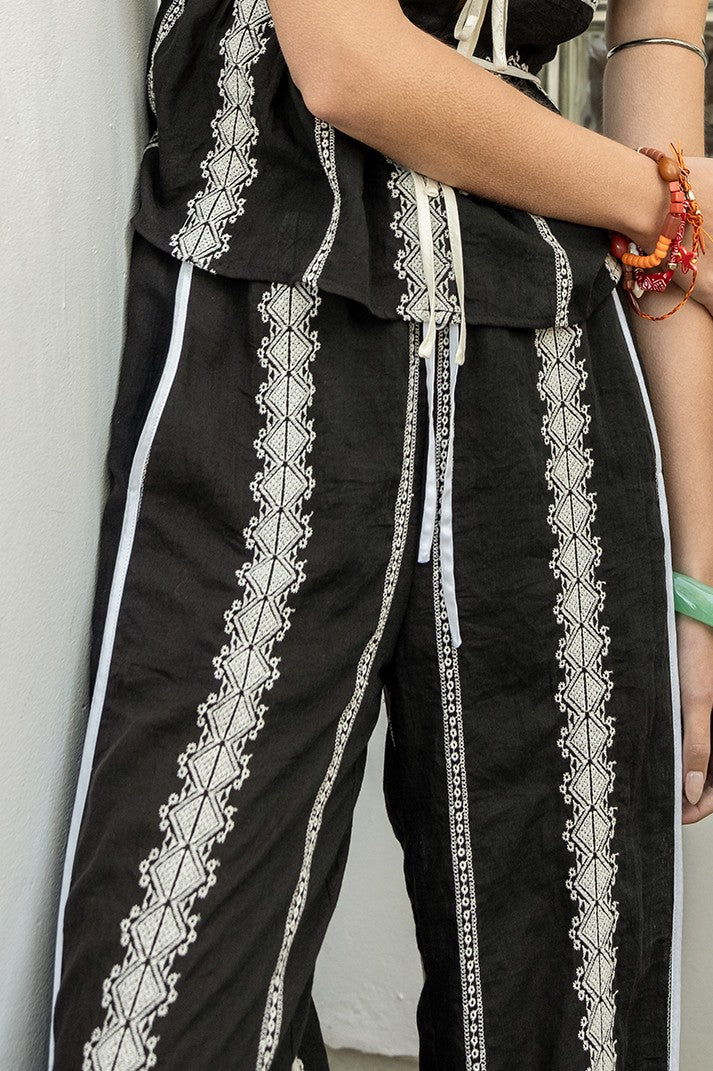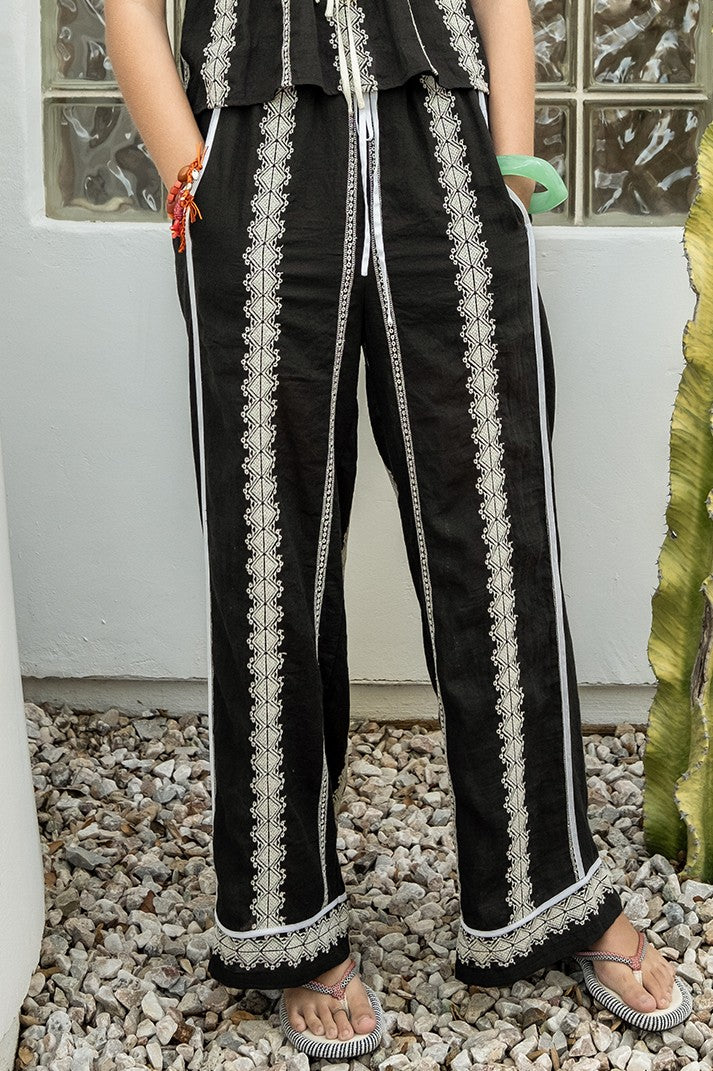 Elevate your everyday style with these versatile Petals & Pleats Pants, designed for comfort and sophistication. Featuring delicate embroidery fabric with contrast binding details, these pants offer a polished look that transitions seamlessly from casual to dressy occasions. The tie-front closure adds a flattering, adjustable fit, while the elastic waistband ensures all-day comfort. Practical side pockets keep your essentials within reach, and the fully lined interior provides coverage and durability. Perfect for anyone seeking quality basics with thoughtful design touches. Pair it with the Petals & Pleats Top!