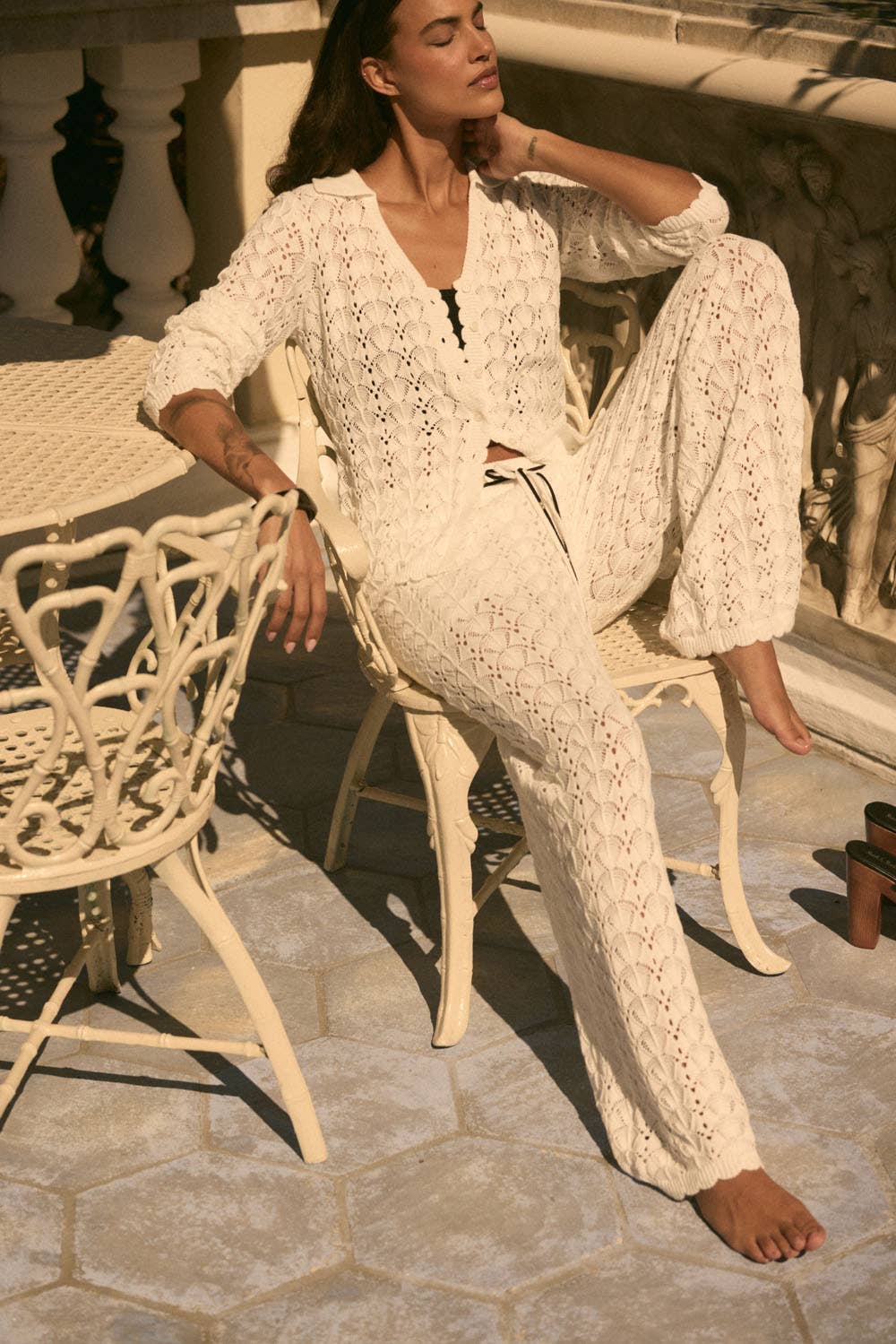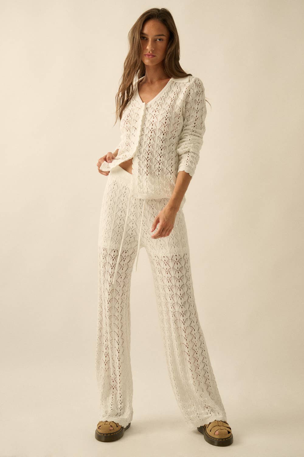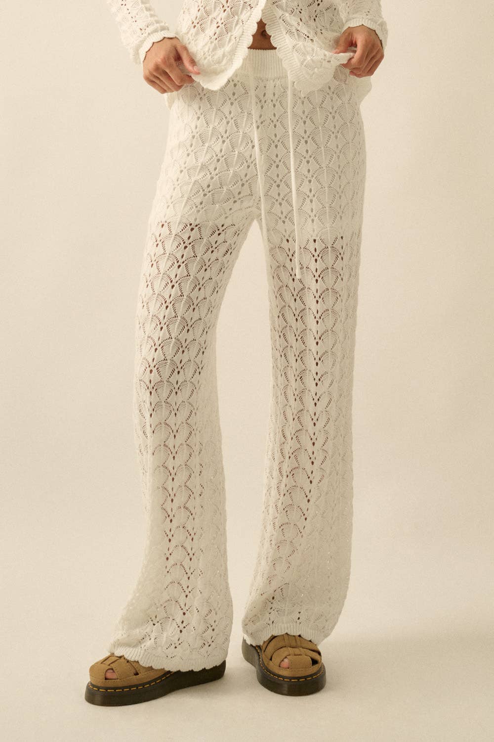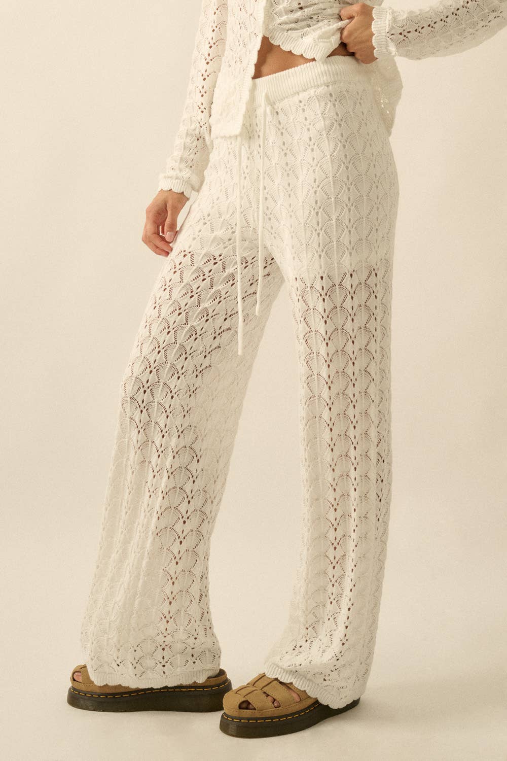 Effortlessly chic and undeniably comfortable, The Drift Knit Pants feature an airy pointelle crochet-knit construction that moves with you. The relaxed wide-leg silhouette pairs perfectly with a drawstring elastic waist for a customizable fit, while the scalloped hem adds a delicate finishing touch. Partial thigh-length lining provides subtle coverage without sacrificing breathability. Whether you're dressing up or keeping it casual, these pants deliver versatile style that feels as good as it looks. Pairs perfectly with the Drift Knit Top.
