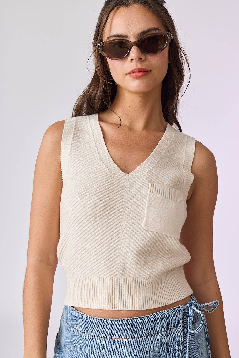 Effortless style meets everyday comfort in this beige V-neck tank top. The flattering V-neckline elongates your silhouette while the cropped length pairs perfectly with high-waisted bottoms for a modern, polished look. Practical front pockets add functionality without compromising on design—finally, a tank that works as hard as you do. Lightweight and versatile, this essential piece transitions seamlessly from casual weekends to layered workwear. A wardrobe staple that delivers both sophistication and practicality.