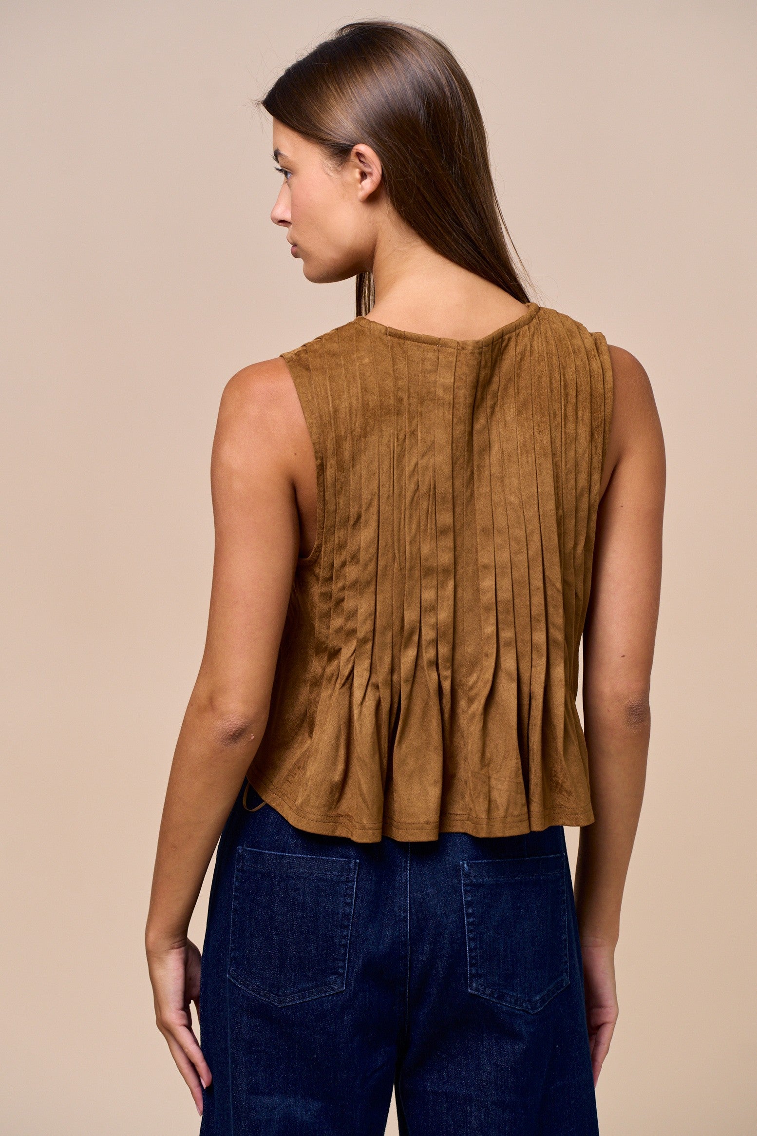 Elevate your casual wardrobe with the Rustic Charm Top. Crafted from soft suede, its sleeveless design and front tie detail create a stylish, textured look that’s both modern and relaxed. Perfect for pairing with high-waisted jeans or a flowy skirt, this top effortlessly blends comfort with a subtle edgy vibe, making it a versatile choice for any occasion.