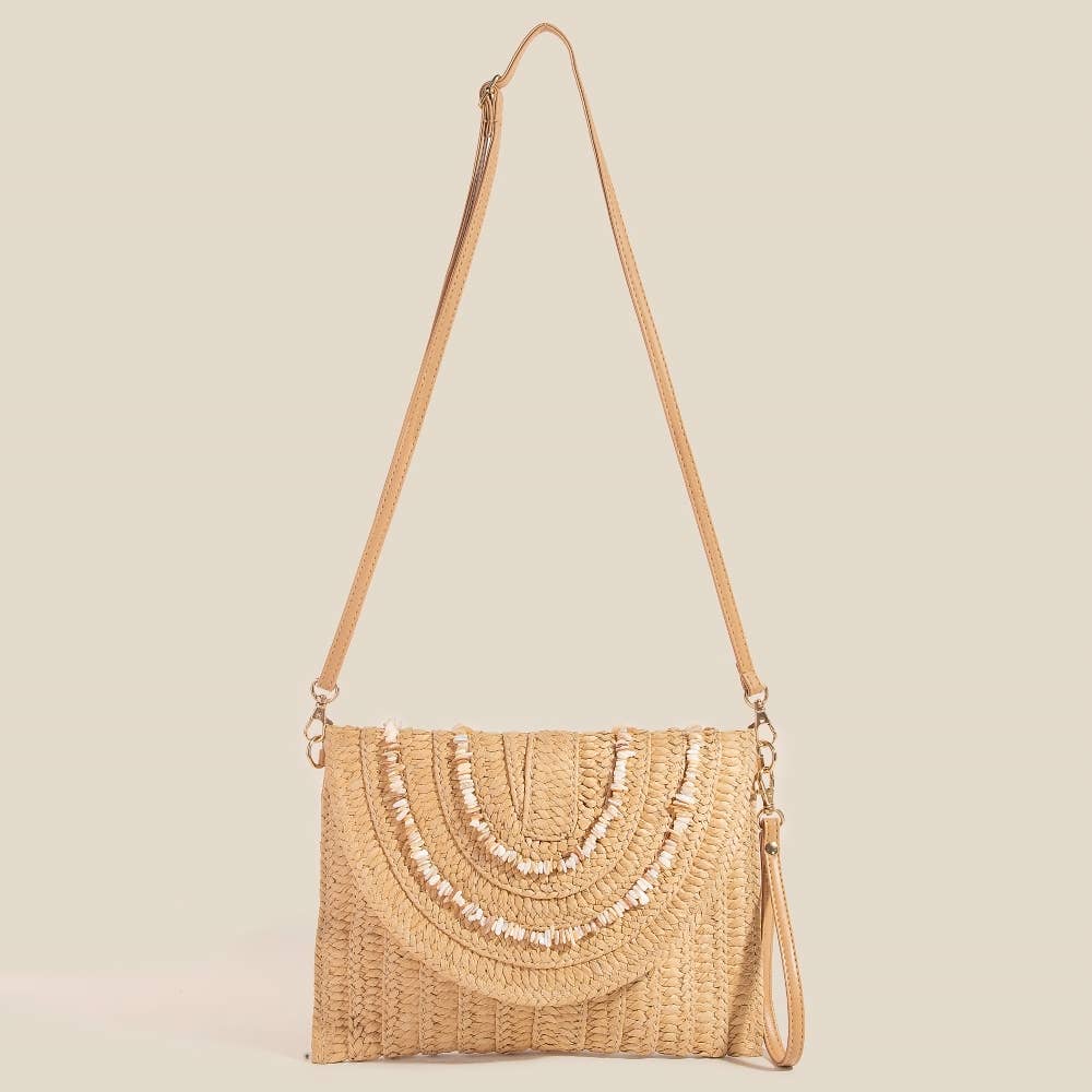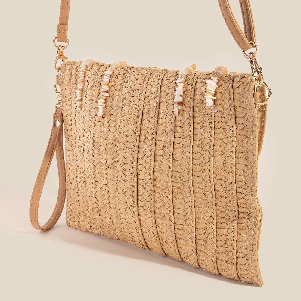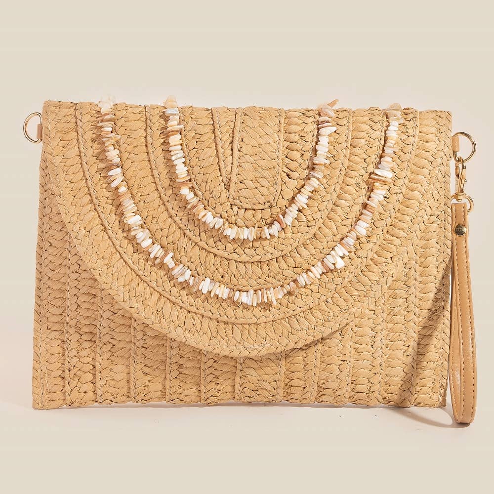 Effortlessly stylish and always on-trend, this clutch bag contains a special shell beaded accent paper woven envelope design. Perfect for dressing up or down, this versatile clutch bag adds a touch of sophistication to any look.