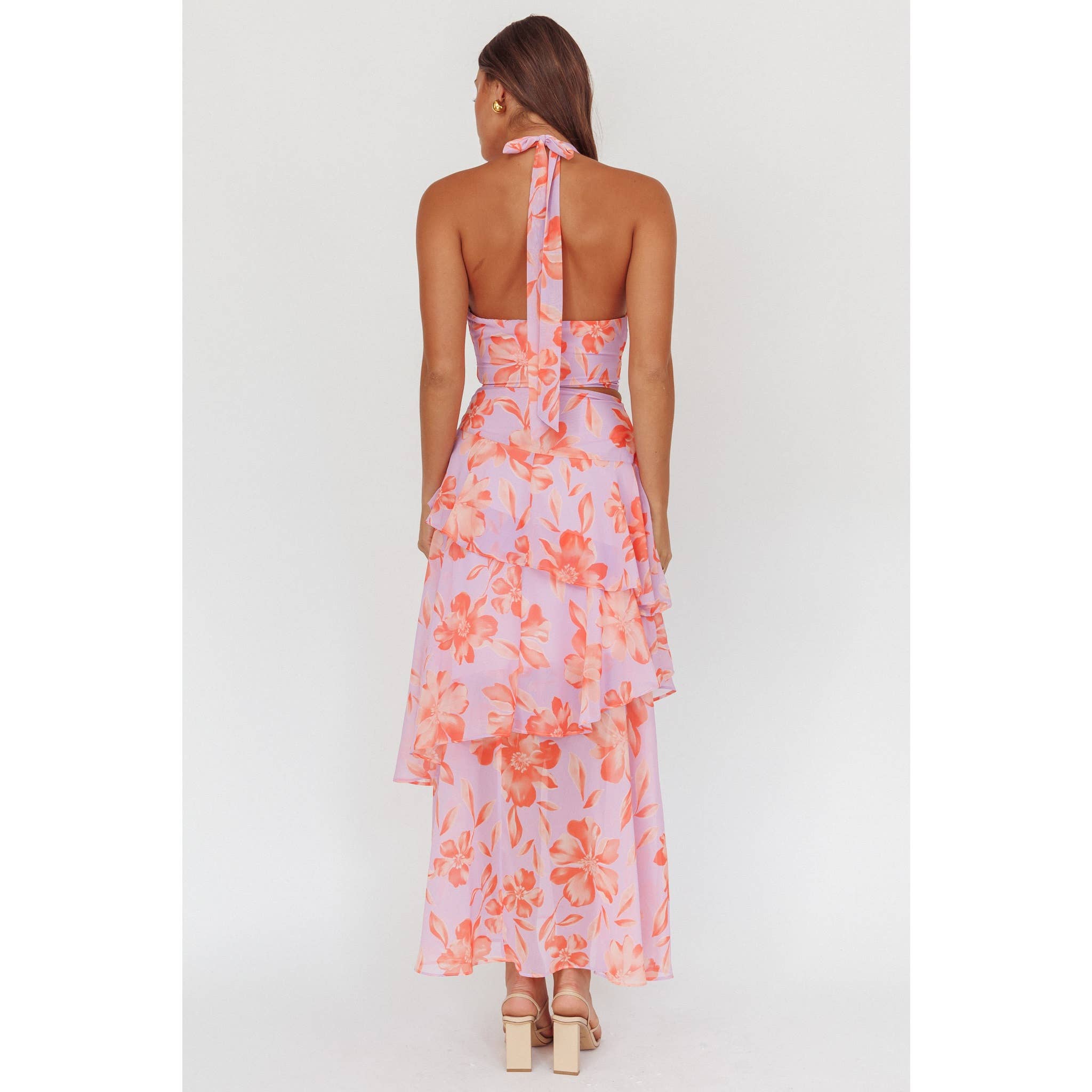 Embrace effortless elegance with the Orchid Whisper Maxi Dress. Its sleeveless design and deep V-neckline highlight your shoulders and décolletage, while thin straps add delicate charm. The fitted bodice with a tasteful midriff cut-out enhances your silhouette, leading to a tiered, ruffled skirt that flows gracefully with every step. Featuring a soft light purple base with bold pink and orange floral patterns, this dress is perfect for making a vibrant yet feminine statement at any occasion.