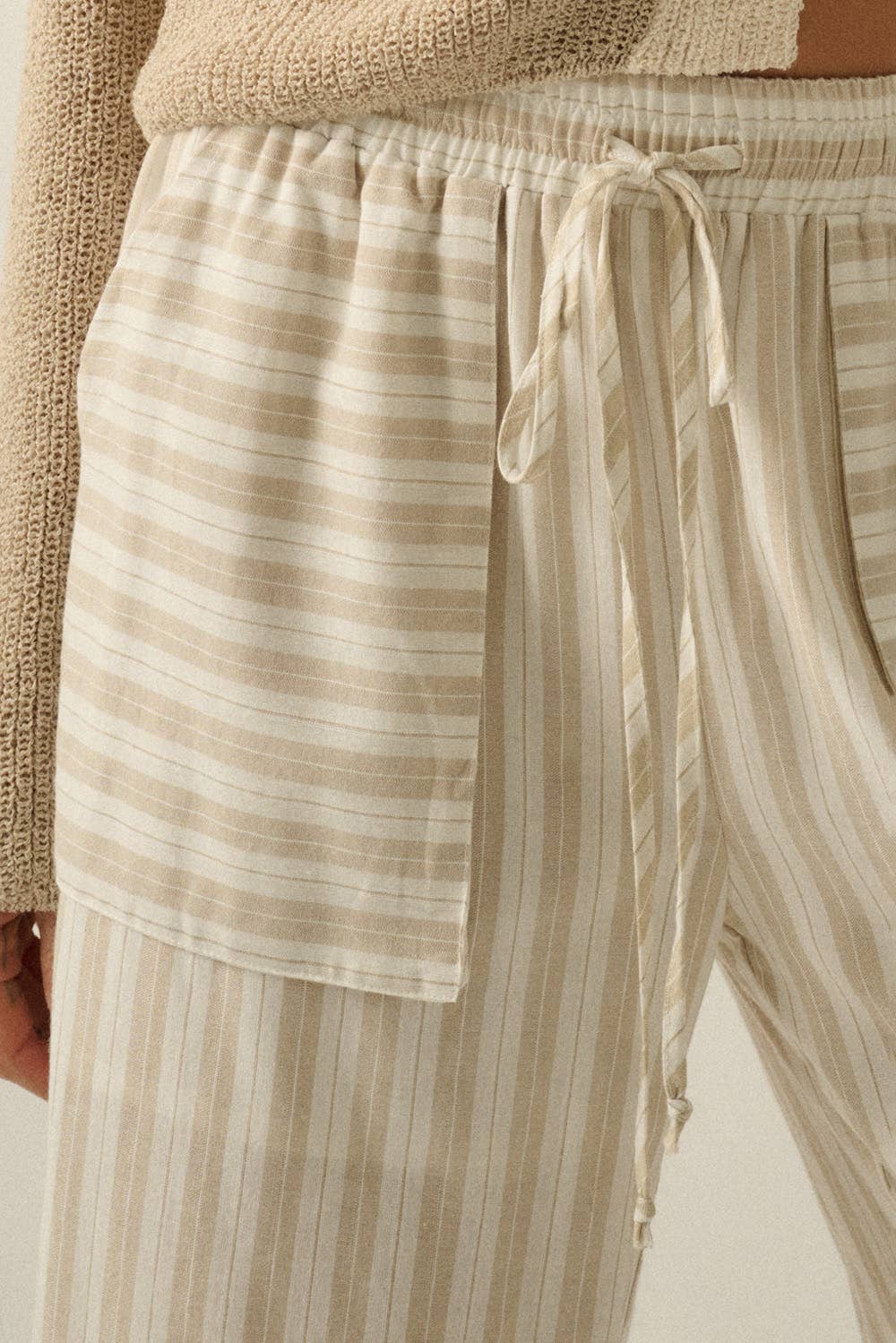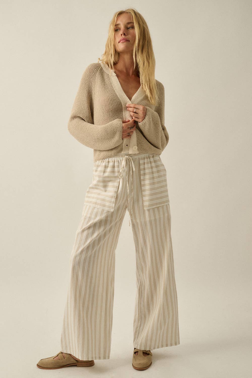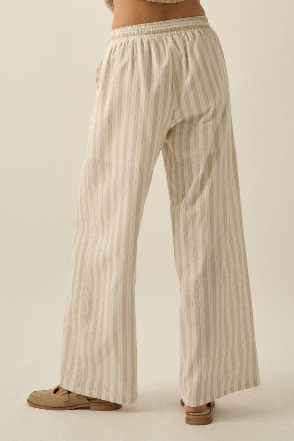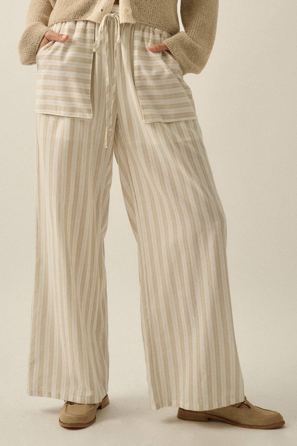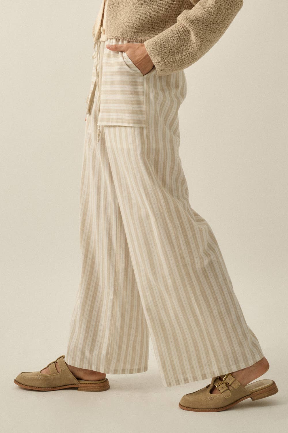 Effortless comfort meets timeless style with the Sandy Shores Pants. Crafted from breathable woven cotton, these striped beauties feature a relaxed wide-leg silhouette that flatters every frame. The adjustable drawstring waist and front patch pockets offer practical ease, while partial thigh lining provides subtle structure without bulk. Perfect for casual days or dressed-up occasions, these ankle-length pants transition seamlessly from season to season. Embrace laid-back elegance that feels as good as it looks.