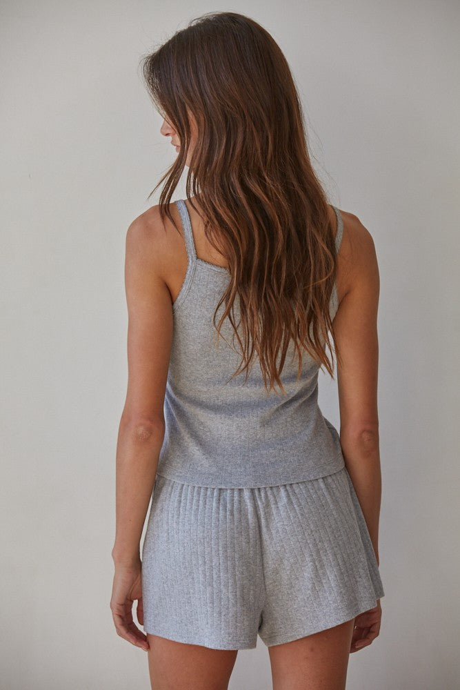 The Summer Whisper Top is a light grey pointelle tank designed for effortless comfort. Perfect for sleepwear or lounging, its breathable fabric keeps you cool and relaxed all day or night. A delicate bow detail at the center adds a touch of charm, making it as stylish as it is cozy. Elevate your downtime with this elegant, soft lounge essential. Pair it with the Summer Whisper Shorts!