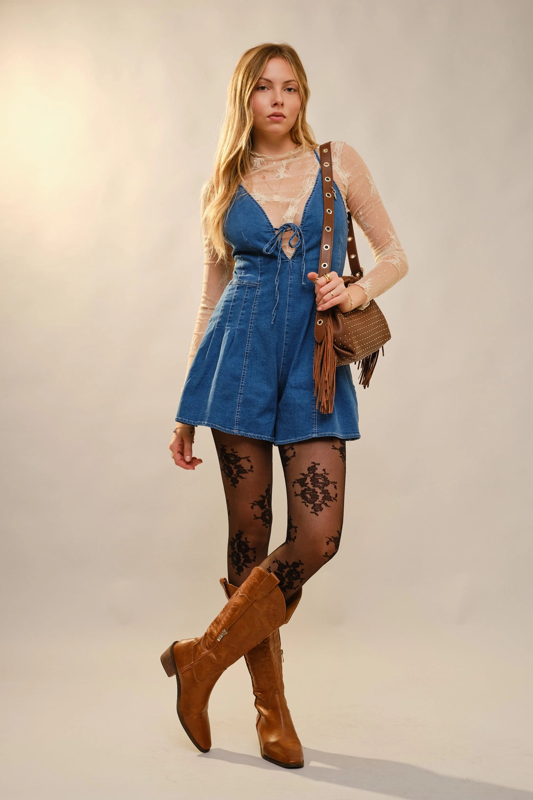 Experience effortless style with the Sunday Stroll Mini Dress. This medium wash A-line romper features a sleek keyhole cutout and delicate spaghetti straps that highlight your shoulders. It's flattering silhouette moves gracefully with you, perfect for casual outings or warm-weather gatherings. Enjoy the blend of denim comfort and chic design that makes this romper a versatile western wardrobe essential.