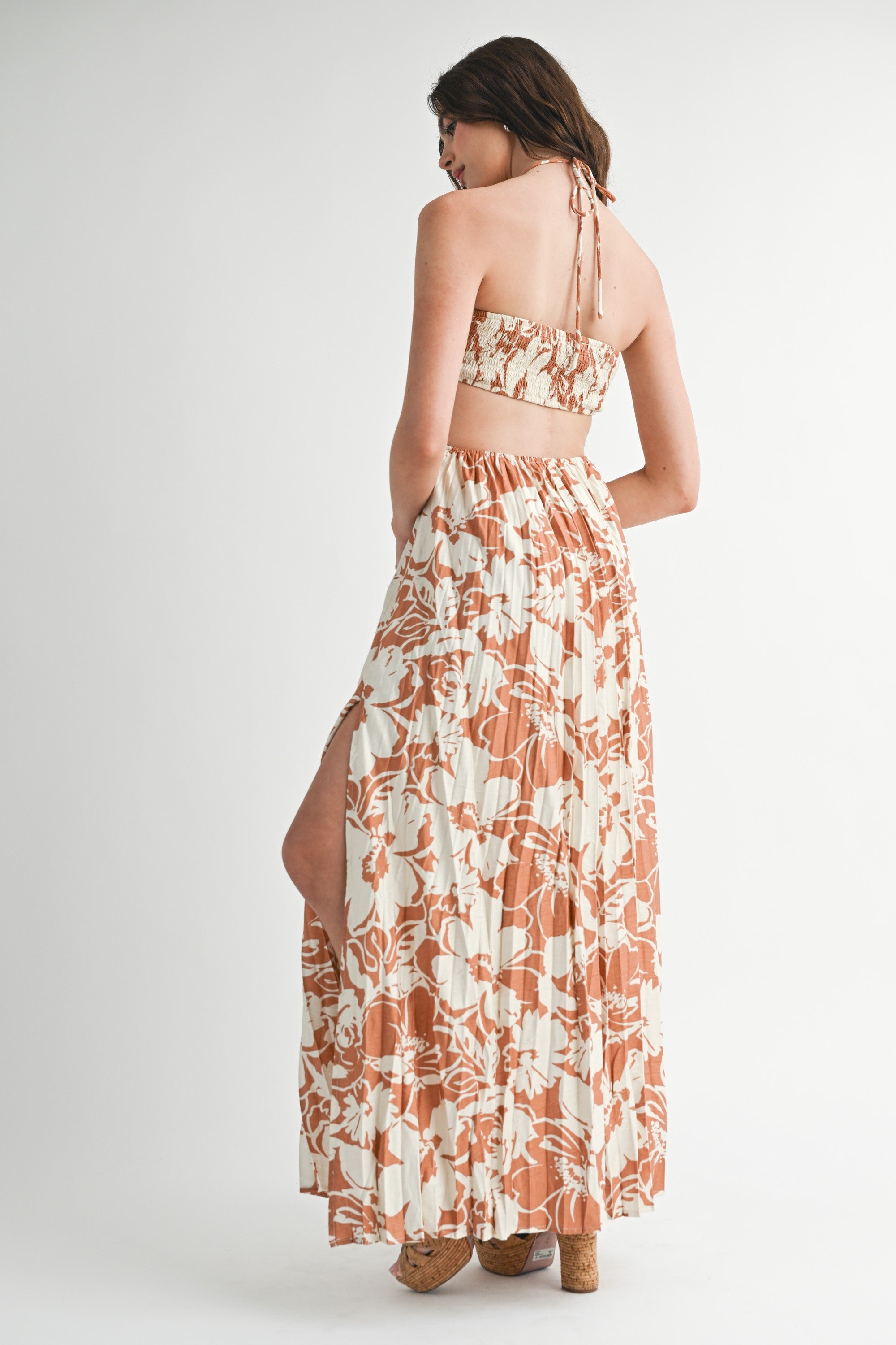 Elevate your wardrobe with this stunning floral maxi dress, featuring a romantic halter neckline with criss-cross detailing and a daring open back. The wrinkle gauze fabric drapes beautifully, while smocked accents and strategic cutouts add modern flair. A side slit and lined construction ensure comfort and movement. Perfect for summer events, beach getaways, or any occasion calling for effortless elegance.