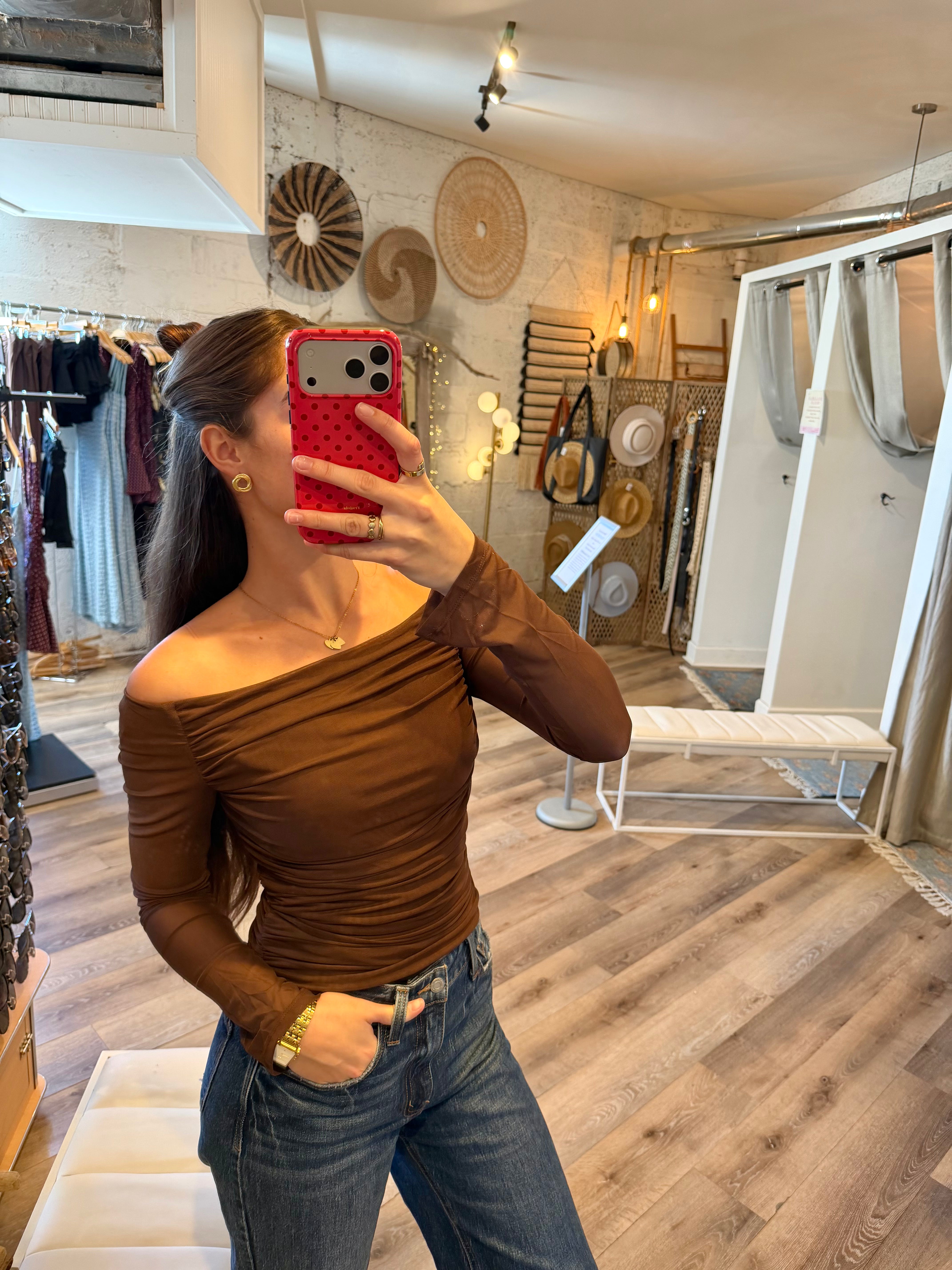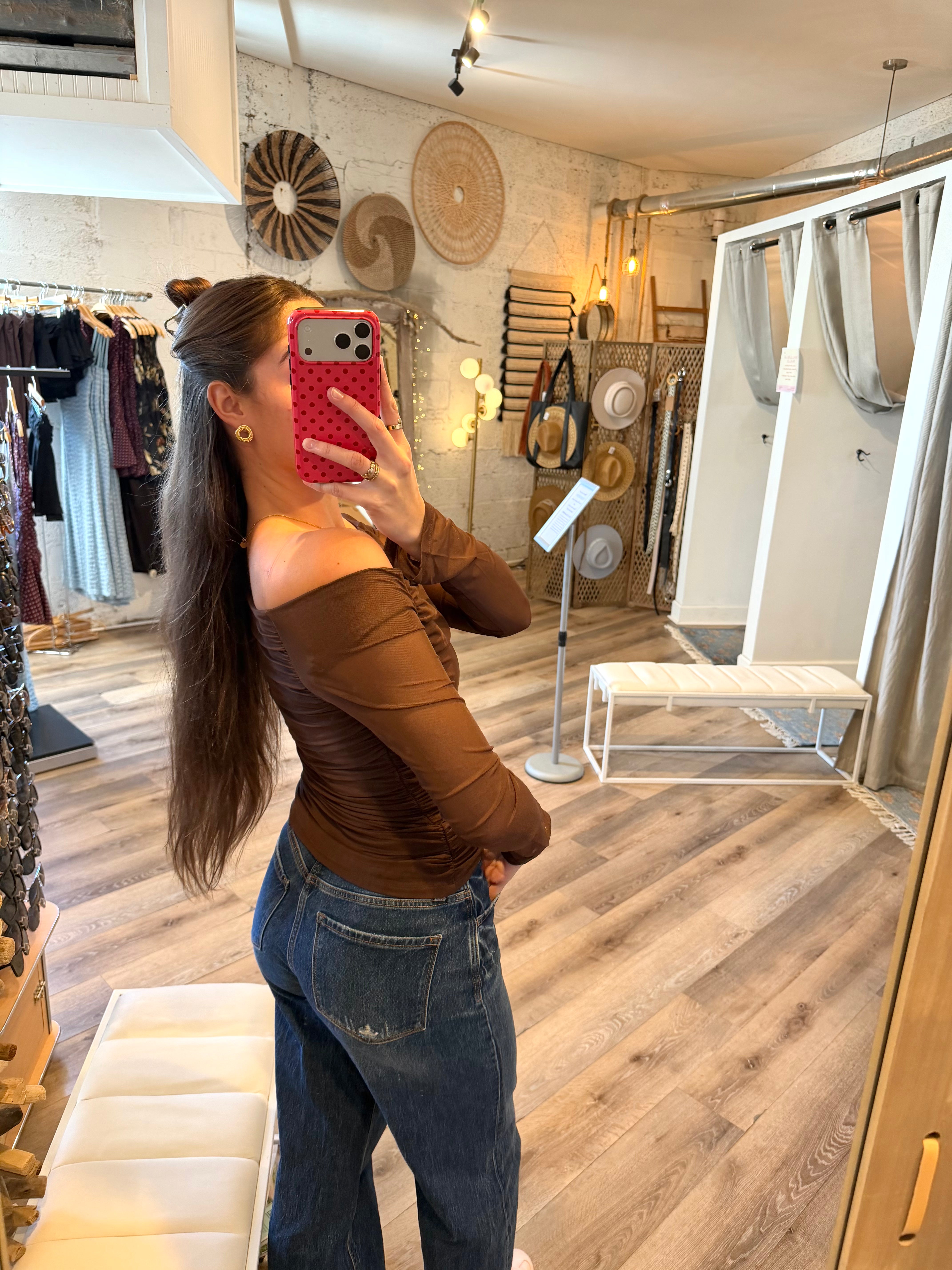 Elevate your wardrobe with the Sweet Cocoa Top, a chocolate-colored, long-sleeve piece that hugs your silhouette for a flattering fit. Its off-the-shoulder design combined with gathered detailing adds a touch of effortless elegance, making it perfect for both casual outings and stylish evenings. This top seamlessly blends comfort and chic, ensuring you stand out with subtle sophistication.