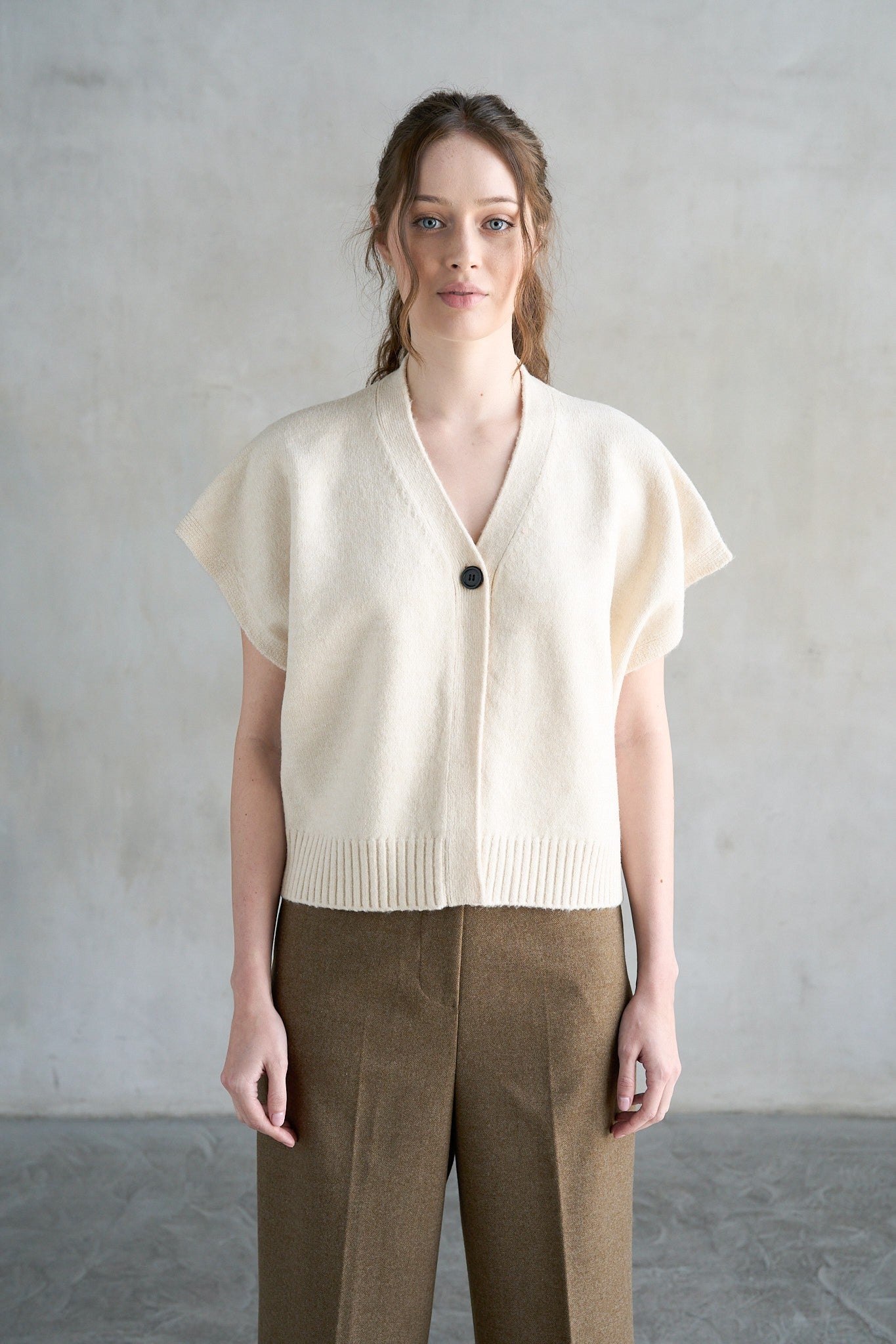 The Maven Vest offers a soft, cozy knit with a rich textured finish that elevates any outfit. Its V-neck with a single button closure adds a subtle touch of style, while the relaxed fit and wide arm openings make layering effortless. Finished with a ribbed hem for structure, this versatile vest transitions seamlessly from cooler days to warmer layers. Perfect to wear over blouses or on its own, it's a must-have piece that combines comfort and sophistication.