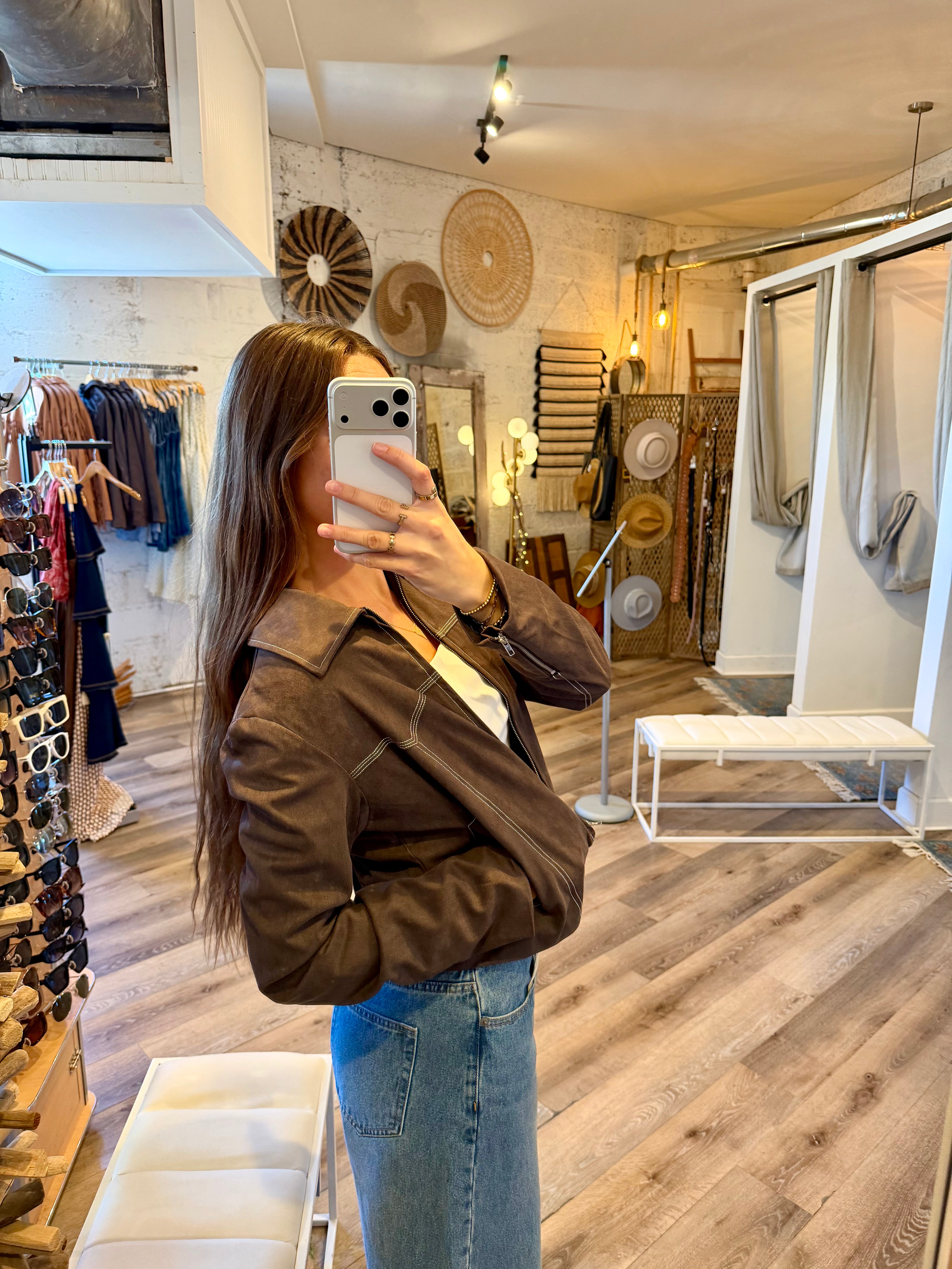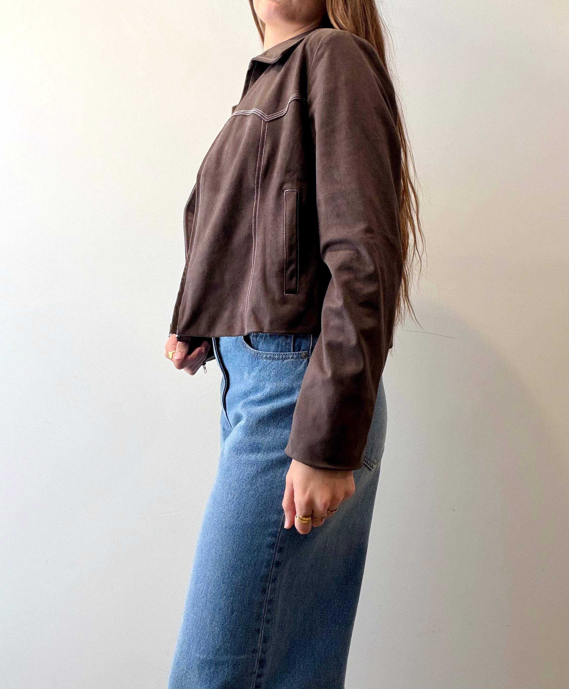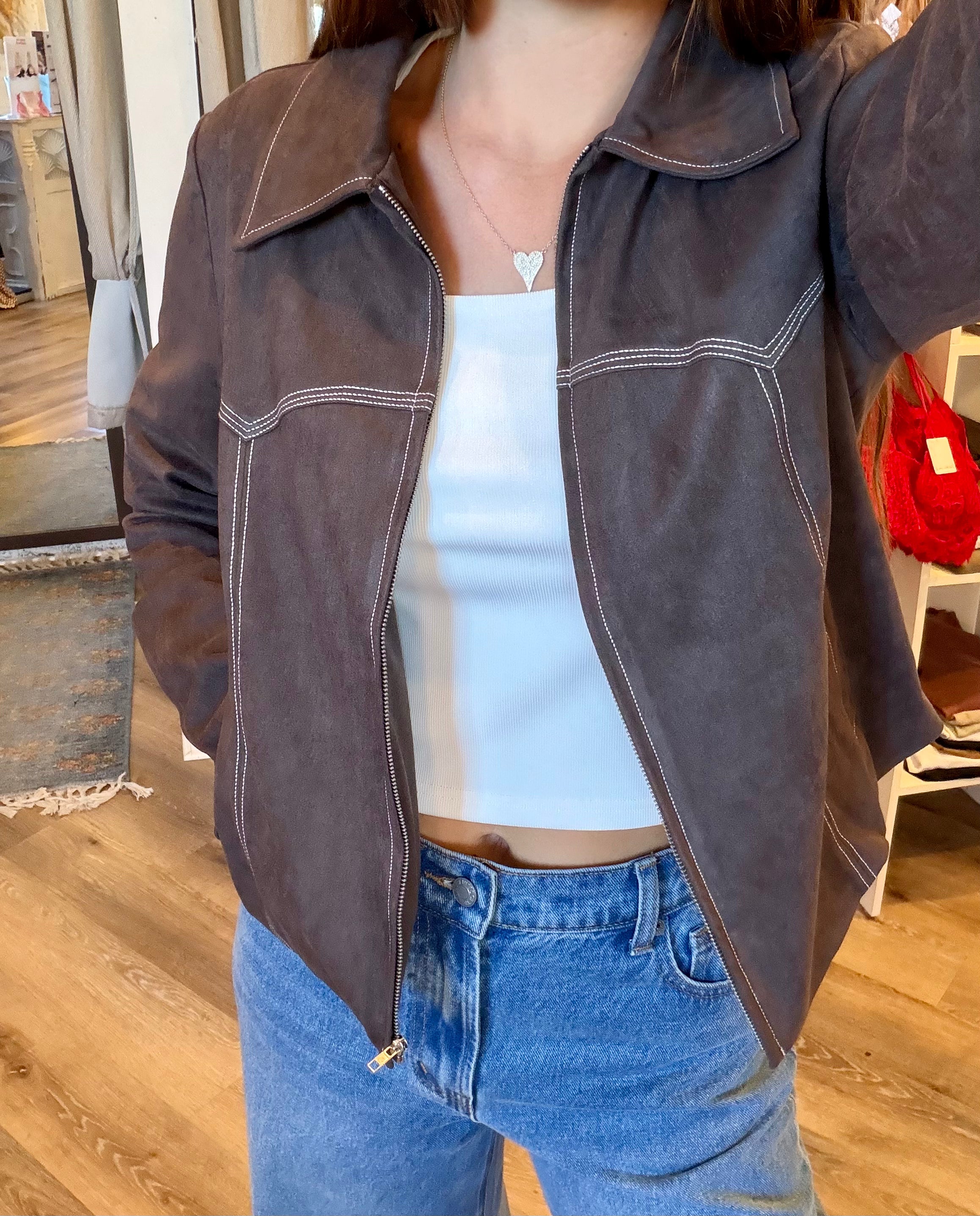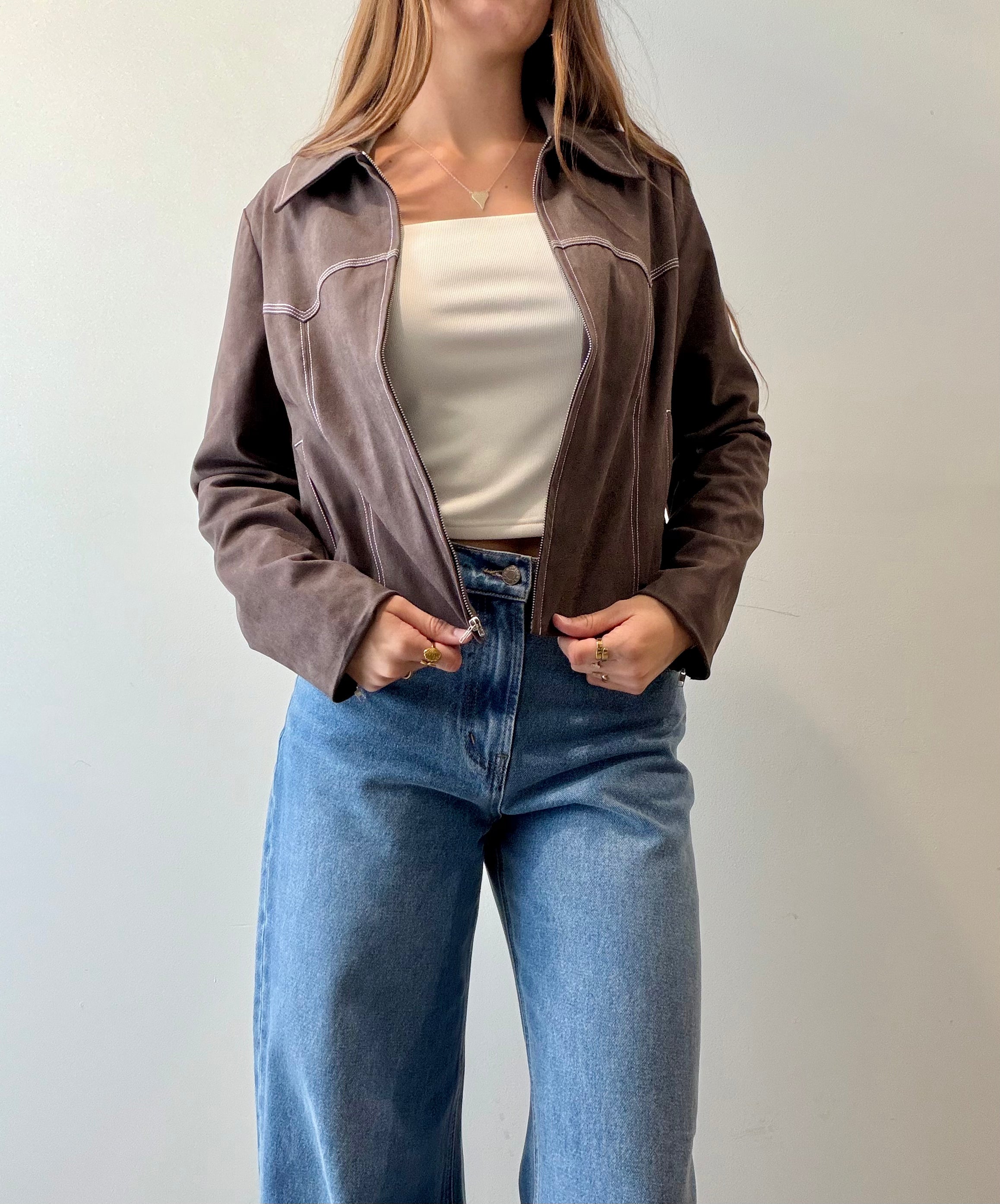 The Maverick Jacket blends rugged western style with refined details. Crafted from dark brown suede, it features striking contrast stitching that highlights its unique design. The collared neck and zip-up front offer a polished yet edgy look, perfect for making a bold statement. Durable and stylish, this jacket is your go-to for embracing a timeless western vibe with modern flair.