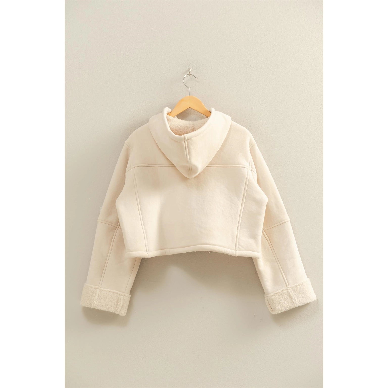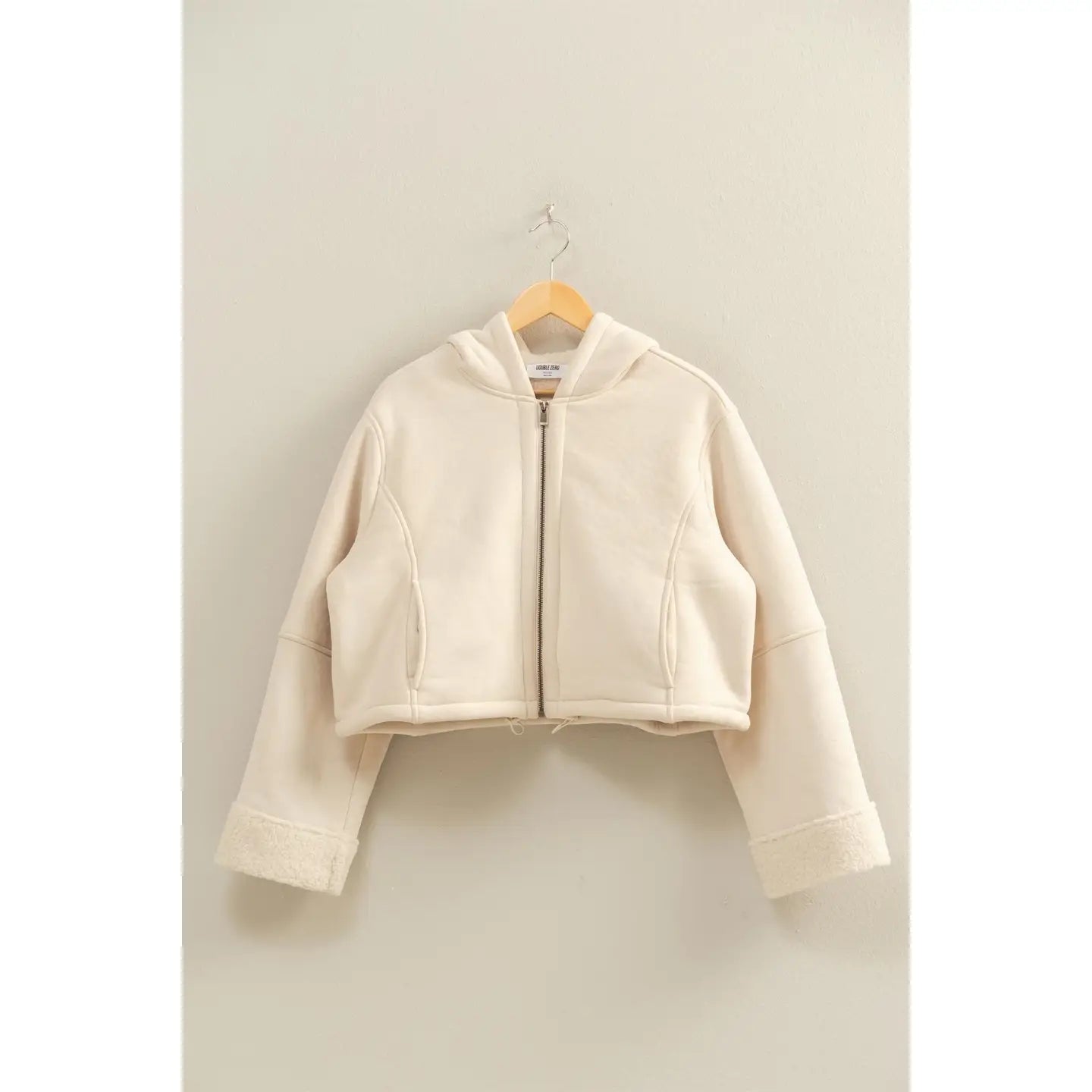 The Vanilla Suede Jacket combines style and comfort with its zip-up front and cozy hoodie. Soft Sherpa cuffs add warmth, making it perfect for chilly autumn evenings. Its versatile design pairs effortlessly with a light turtleneck, fitted jeans, and boots for a polished, casual look. Ideal for layering during transitional seasons or a relaxed night out, this jacket is a must-have addition to your wardrobe.