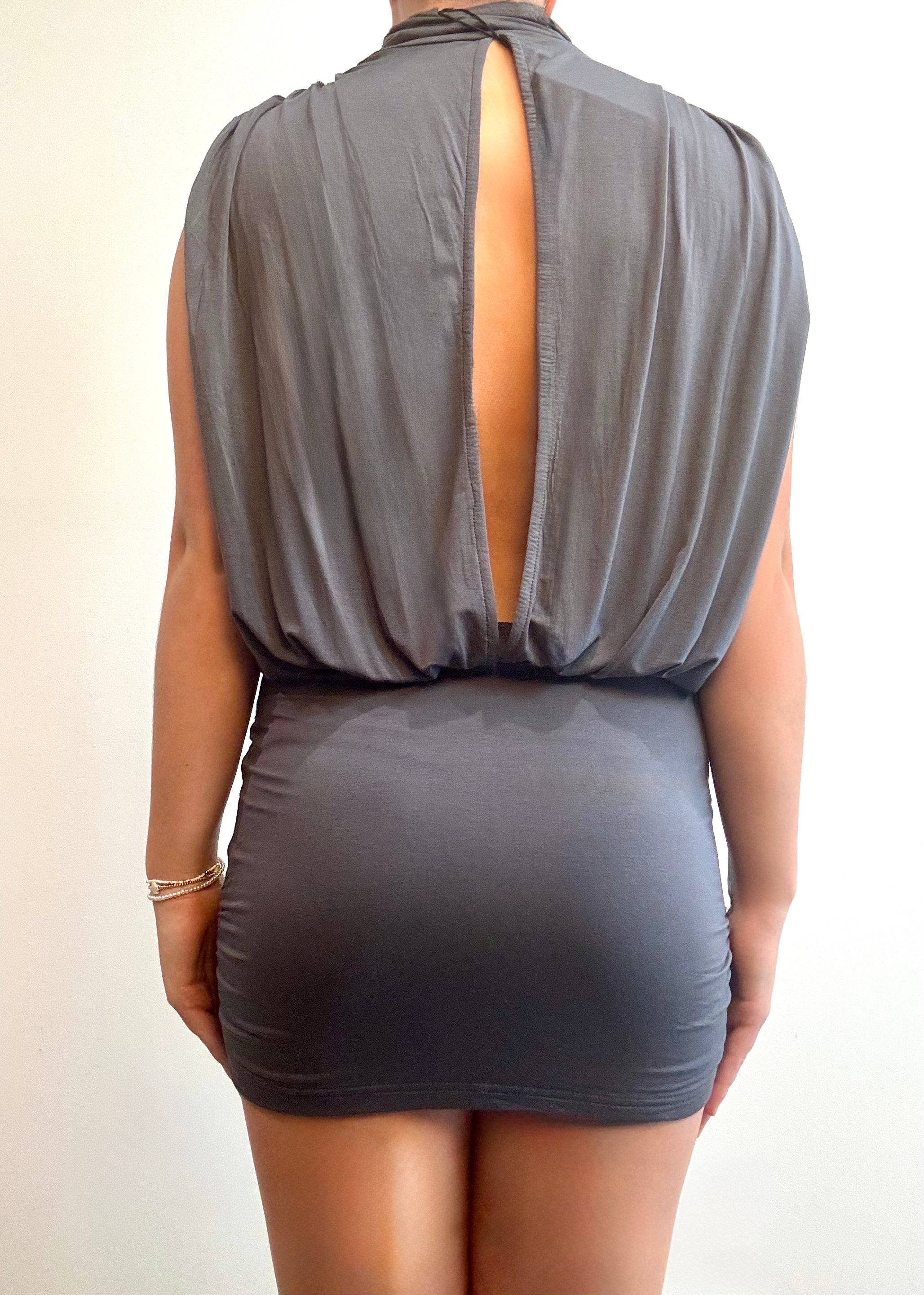 Elevate your style with the Velour Contour Mini Dress, designed to hug your silhouette with a cinched waist and fitted bottom for a flattering look. Its sleeveless, drapey fabric flows effortlessly, while the mockneck and squared neckline add a modern, chic edge. Perfect for turning heads at any event, this mini dress combines comfort and sophistication in one stunning piece.