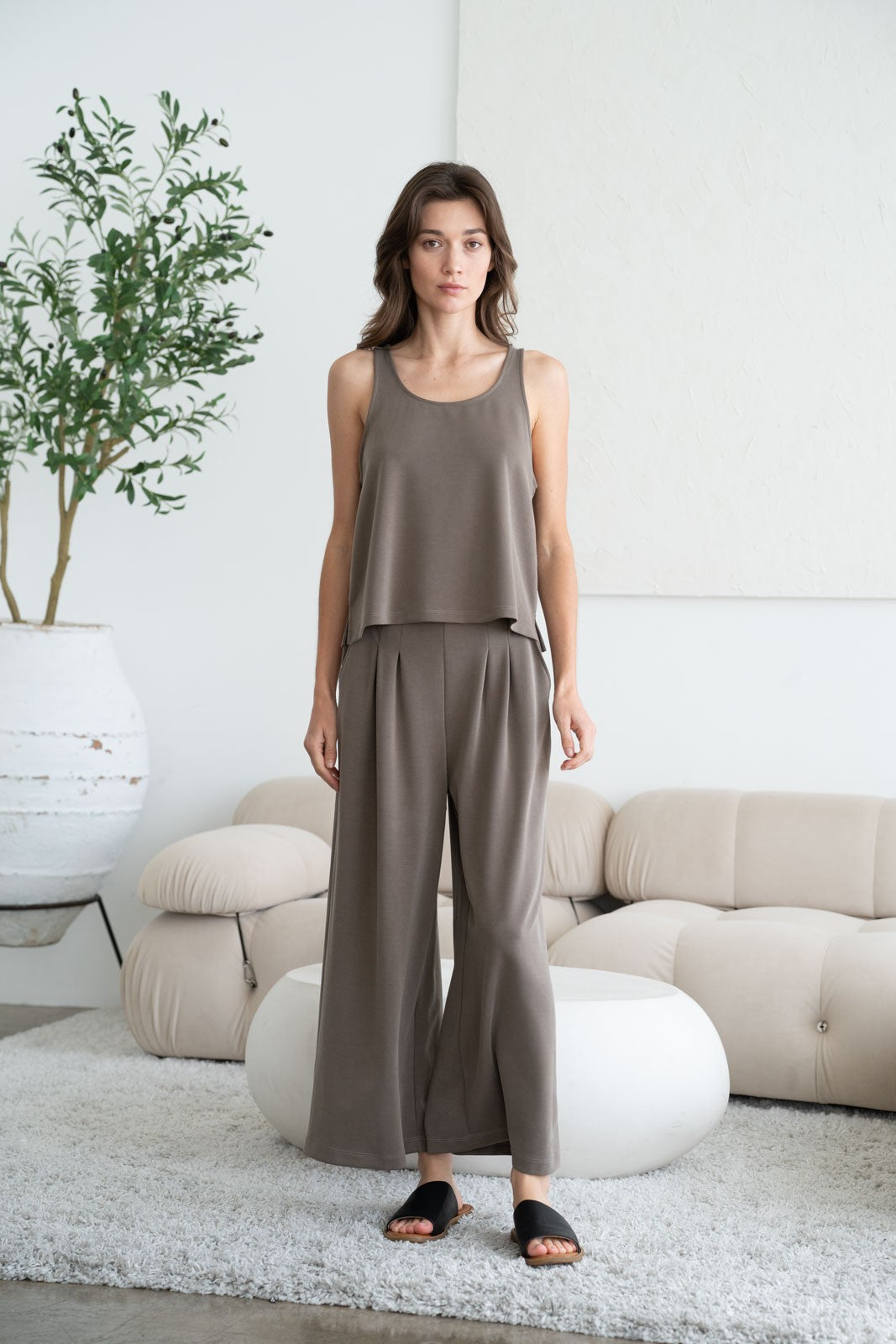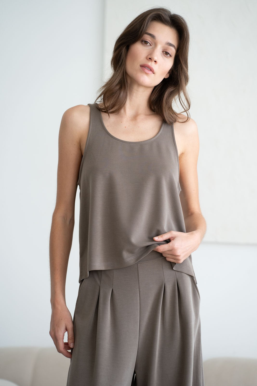 The Velour Drift Top features a relaxed, drapey silhouette that layers effortlessly over any outfit. Its slightly cropped length hits at the waist, creating a flattering and modern look. Crafted from smooth, fluid fabric with a soft hand feel, this scoop neck tank is perfect as a lightweight base layer for warm days or polished enough to wear under a blazer. Elevate your wardrobe with this versatile essential that combines comfort and style seamlessly. Pair it with the Velour Drift Shorts or Pants!