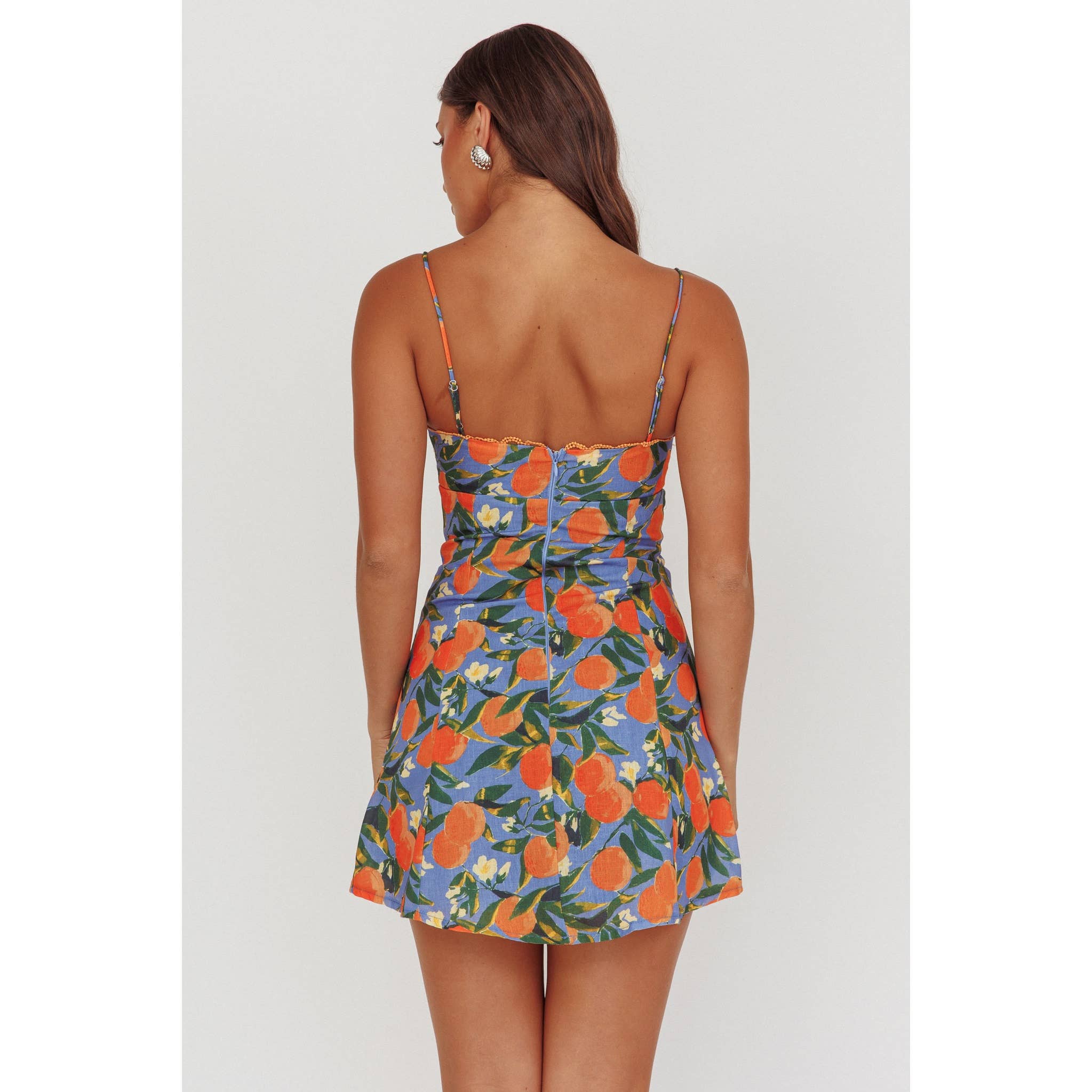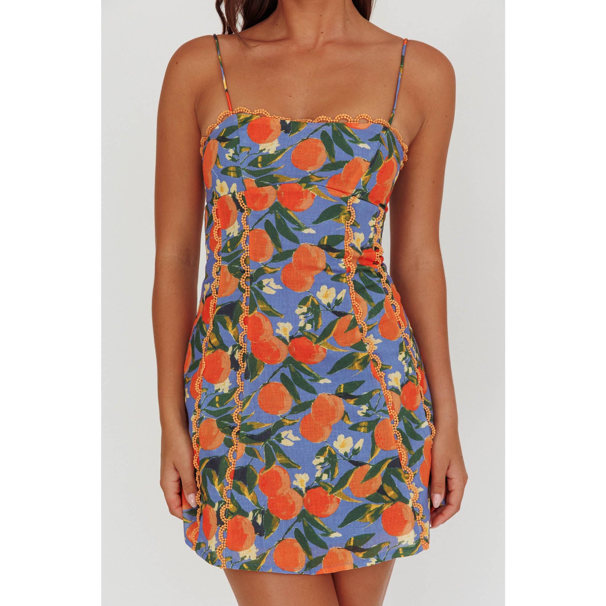 Embrace sunny days in the Amalfi Blossom Mini Dress, featuring delicate spaghetti straps and a flattering straight neckline. Its vibrant blue fabric bursts with lively orange fruits, green leaves, and white flowers, creating a playful, summery vibe. The scalloped lace trim along the edges adds a subtle, feminine detail that elevates this mini dress, making it perfect for casual outings or garden parties. Light, fresh, and effortlessly stylish, it’s designed to brighten your wardrobe with comfort and charm.