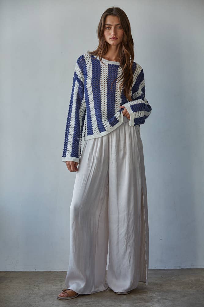 Embrace effortless coastal style with the Coastal Current Top, a versatile knit sweater that transitions seamlessly from casual days to relaxed evenings. Crafted from a comfortable cotton-acrylic blend, this pullover features a timeless navy and white striped pattern that pairs with virtually everything in your wardrobe. The round neckline and long sleeves offer classic appeal, while the quality crochet construction ensures durability and a refined finish. Perfect for layering or wearing solo, this striped top delivers everyday comfort without compromising on style.