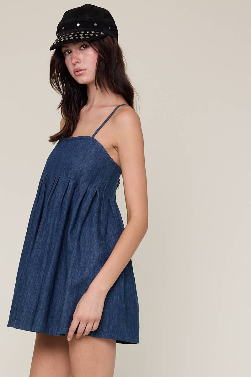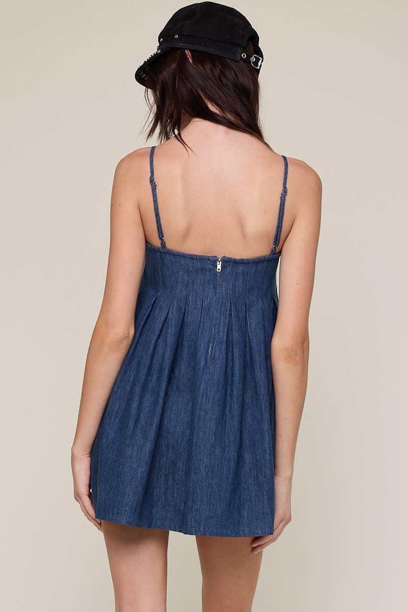 Elevate your summer wardrobe with the Denim Haze Mini Dress, crafted from 100% cotton for breathable comfort. Featuring a washed denim print, square neckline, and adjustable straps, this sleeveless dress offers a flattering fit tailored to you. The back zipper ensures easy wear while the swing silhouette adds playful movement. Perfect for day-to-night style, this mini dress combines casual ease with chic detail for effortless, confident looks.